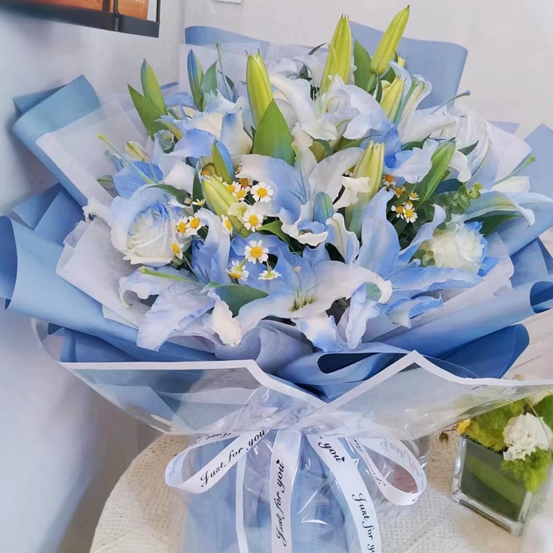 花 材:6枝多头碎冰蓝百合,2朵碎冰蓝玫瑰,小雏菊搭配