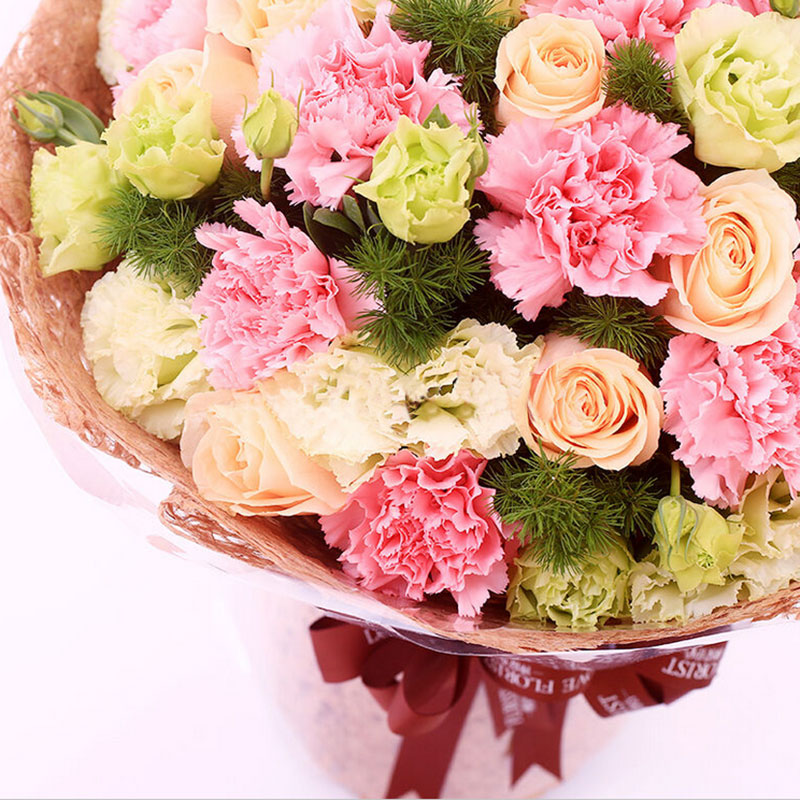 花 材:19枝粉康乃馨,9枝香槟玫瑰,桔梗、蓬莱松。