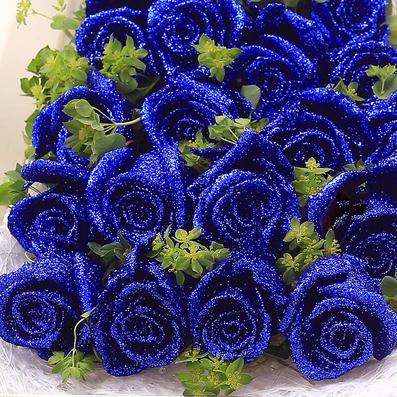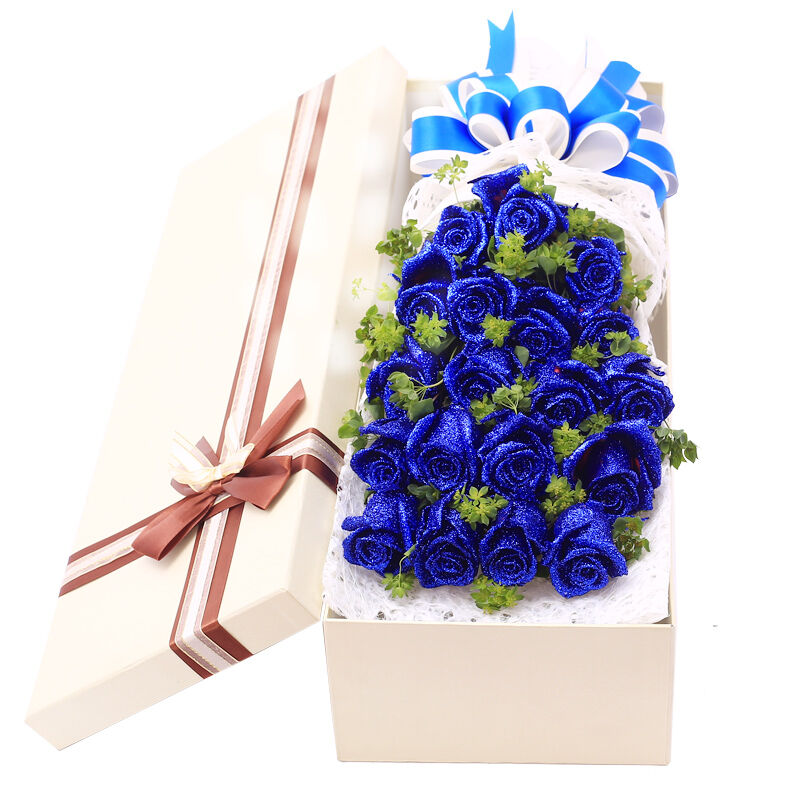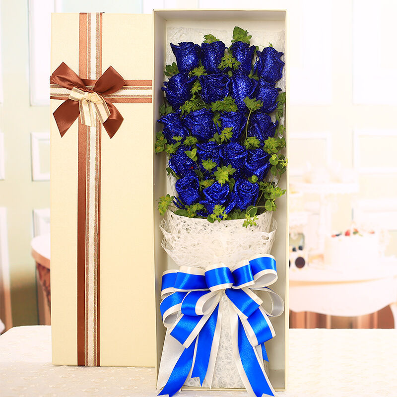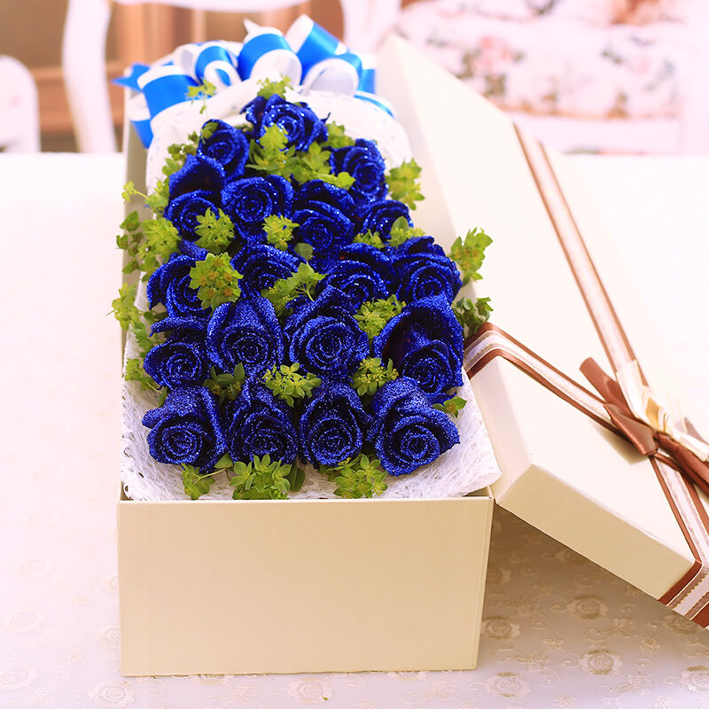 花材: 19支精品蓝色妖姬,搭配适量叶上黄金。