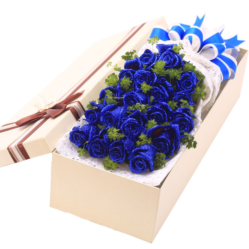 花 材:19支精品蓝色妖姬,搭配适量叶上黄金。