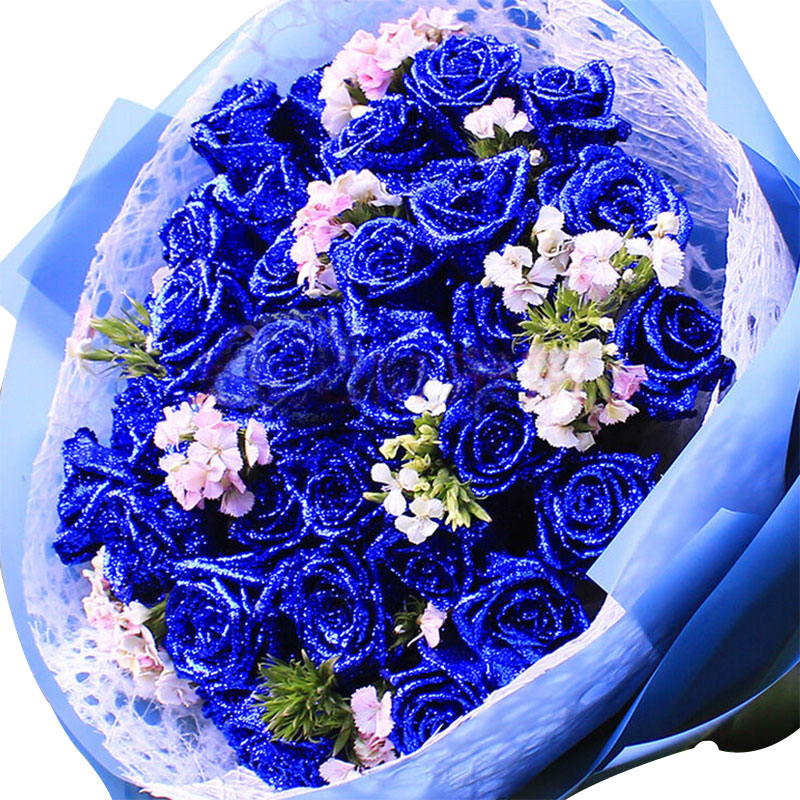 花材: 33支精品蓝色妖姬,搭配适量相思梅。