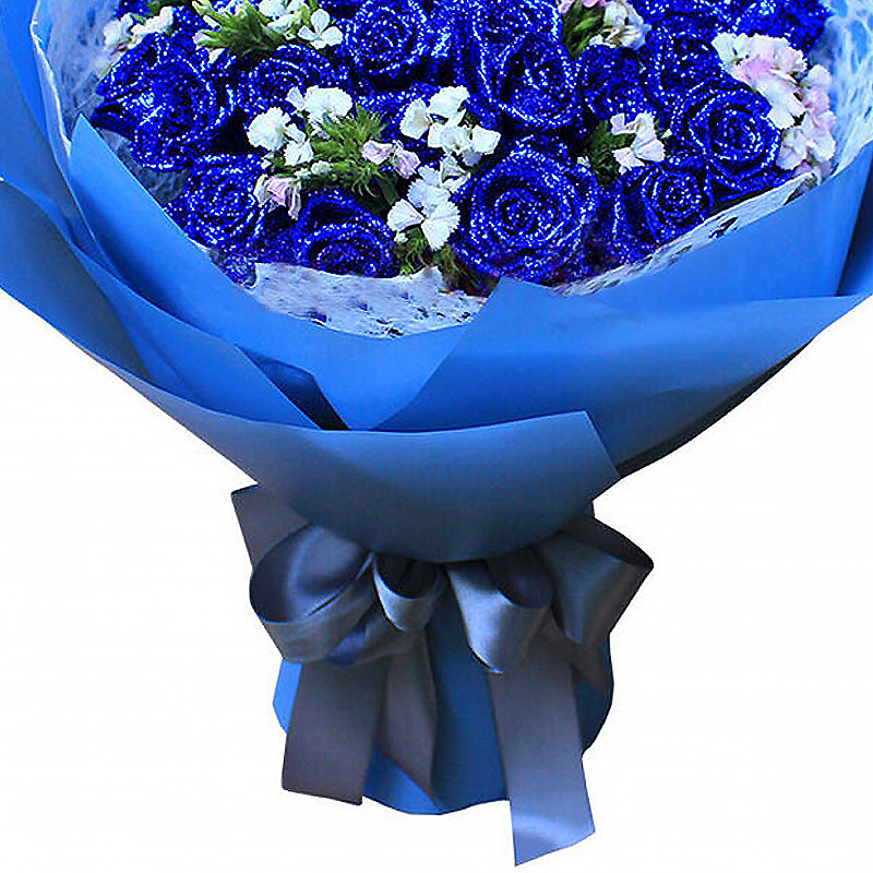 花 材:33支精品蓝色妖姬,搭配适量相思梅。