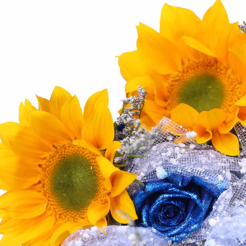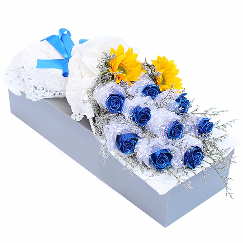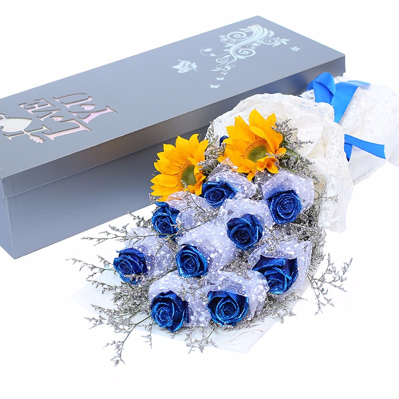 花 材:9支精品蓝色妖姬+2支向日葵,搭配水晶草。