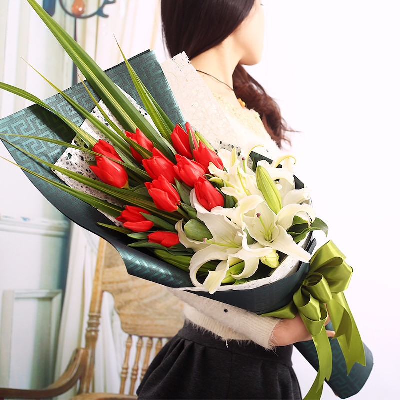花材: 11支精品红色郁金香,搭配3支多头百合。