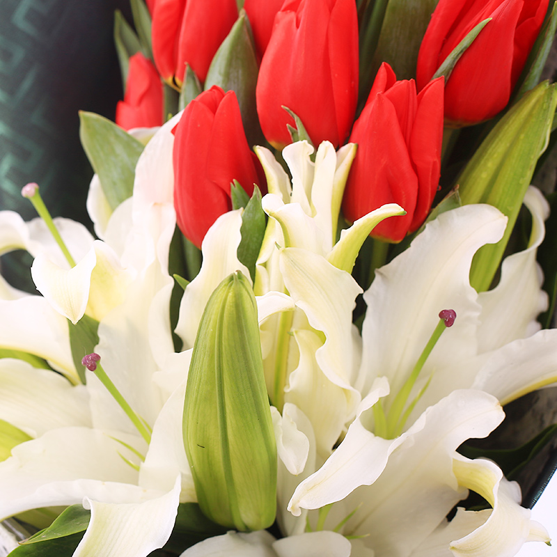 花 材:11支精品红色郁金香,搭配3支多头百合。