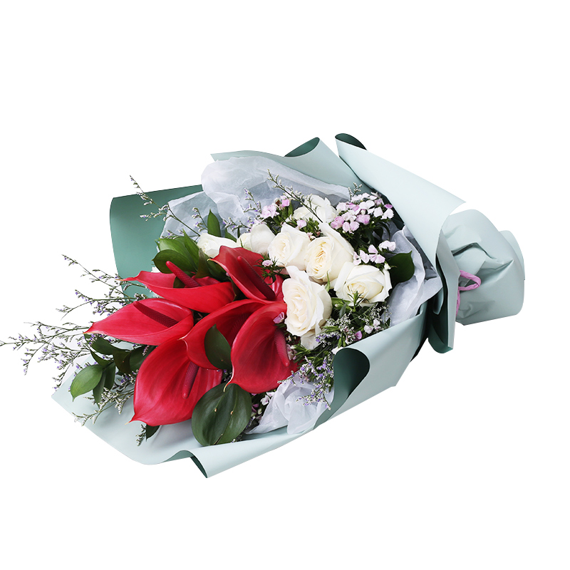 花 材:9朵白玫瑰,5枝红掌,搭配相思梅、水晶草、栀子叶。
