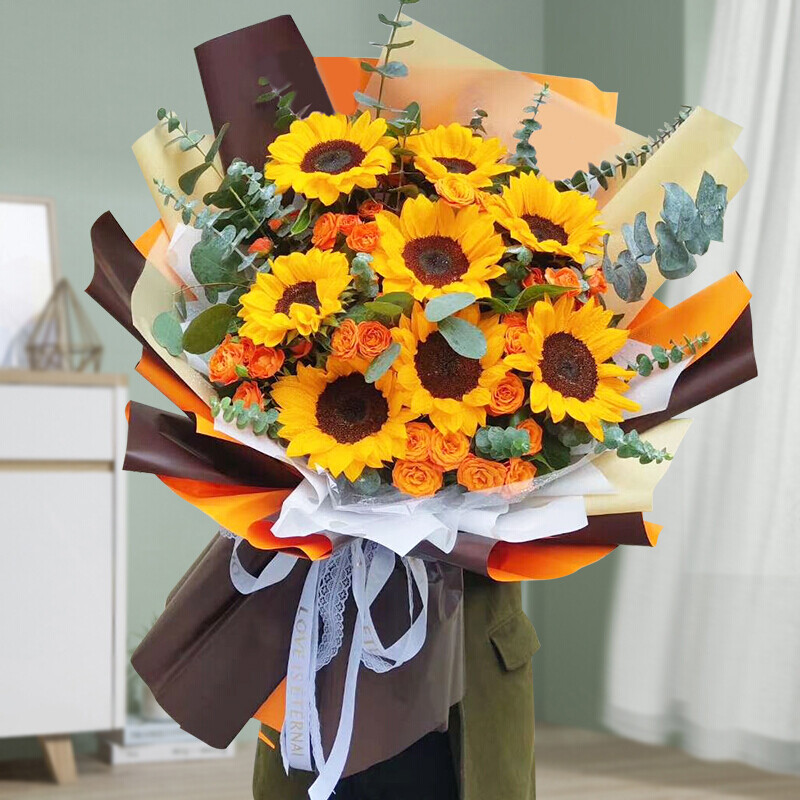 花 材:8支精品向日葵,搭配6支多头橙色小玫瑰(若断货则用6支洋桔梗代替),尤加利叶装饰。