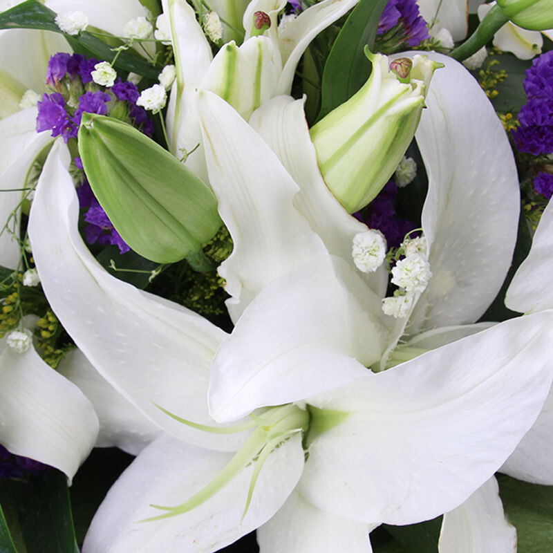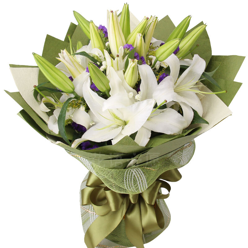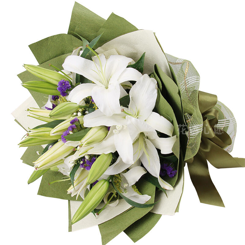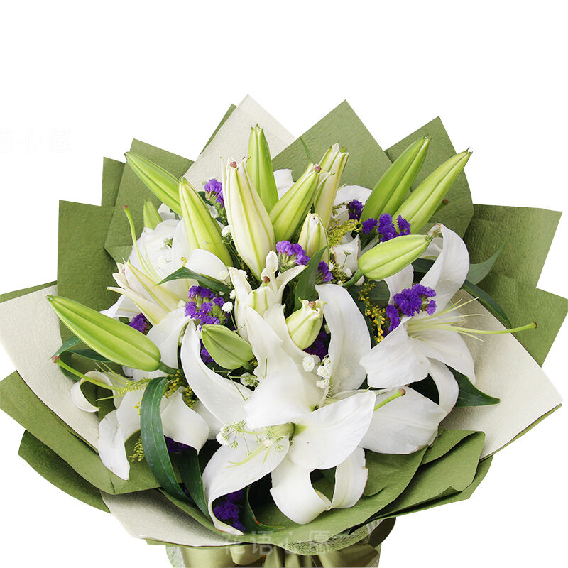 花 材: 21朵白百合,满天星、黄莺、勿忘我点缀。