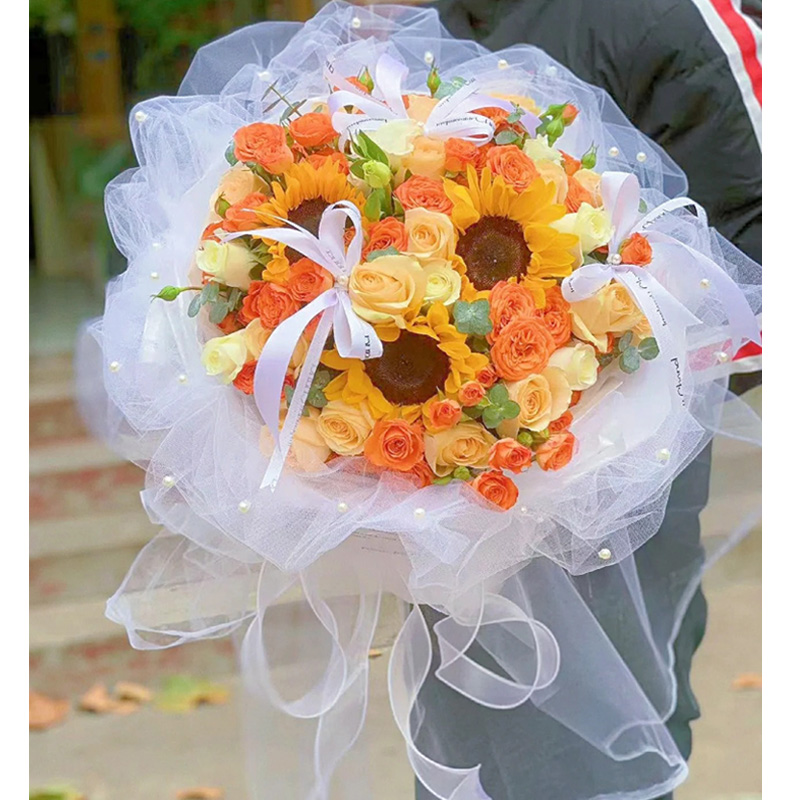 花 材:3朵向日葵,香槟玫瑰、白玫瑰、黄玫瑰混搭共19朵,多头橙色小玫瑰8支,3朵缎带小蝴蝶结装饰花面,尤加利叶、洋桔梗间插配饰。