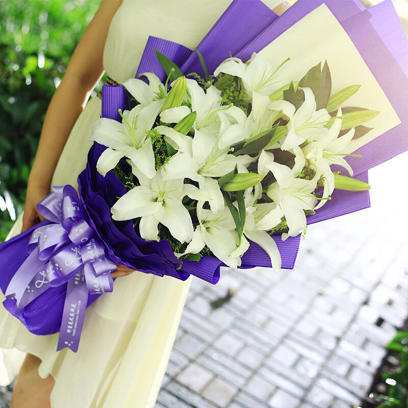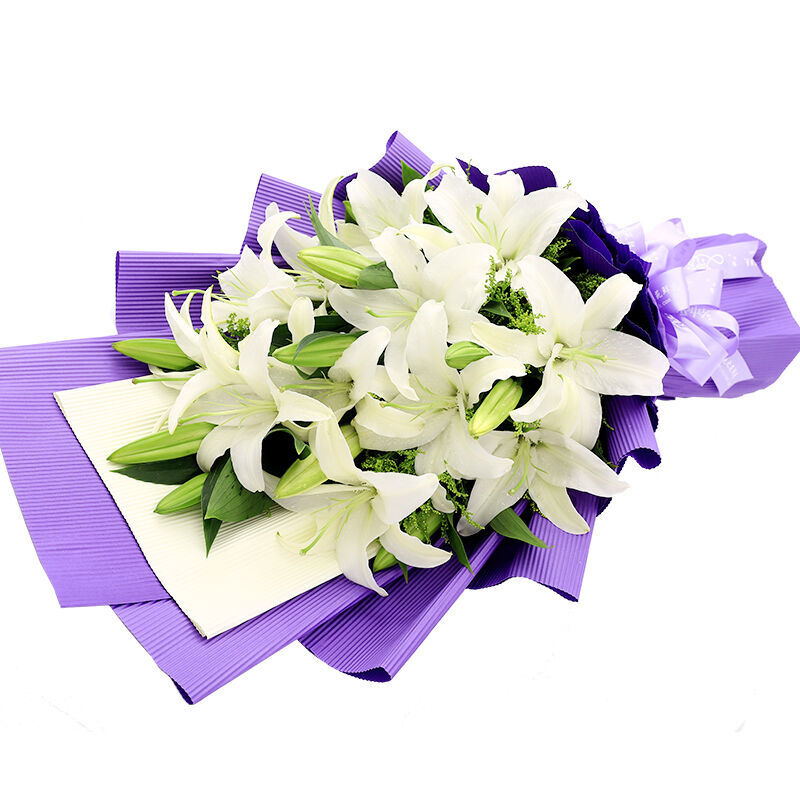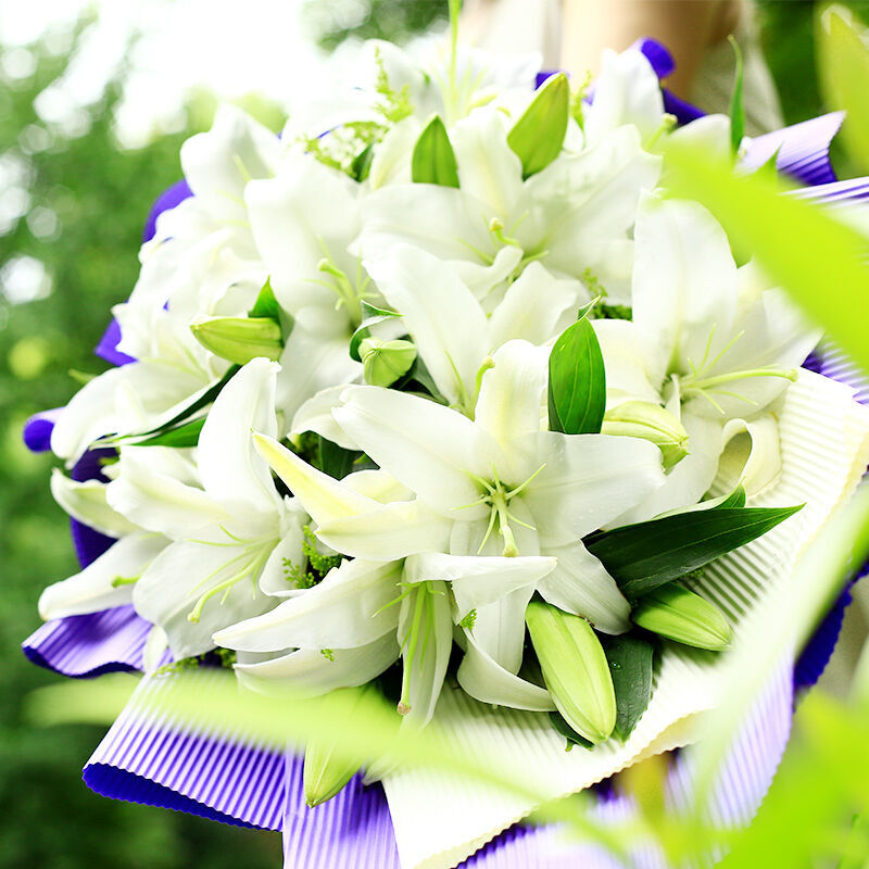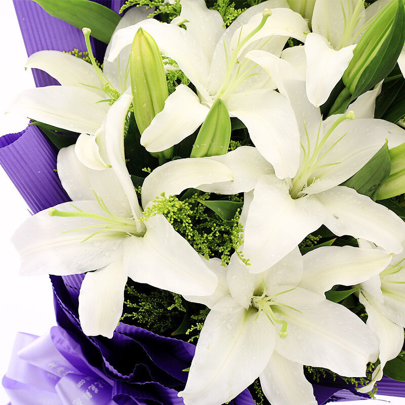 花材: 精选16朵香水白百合,新鲜黄莺点缀。