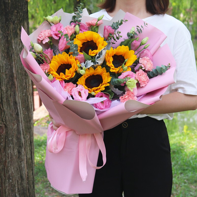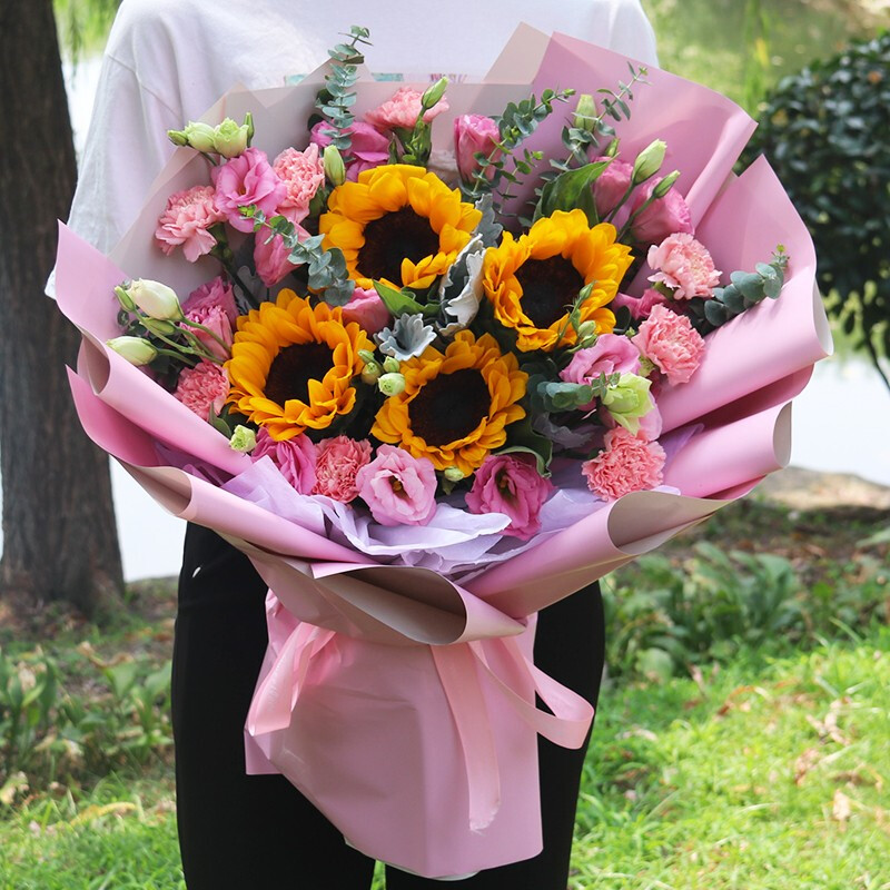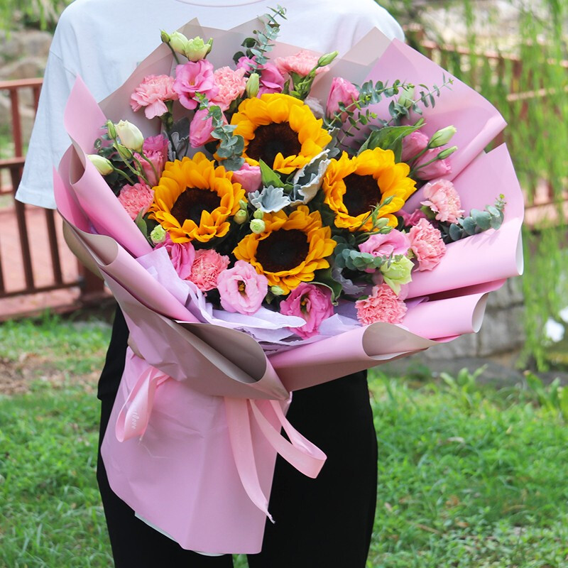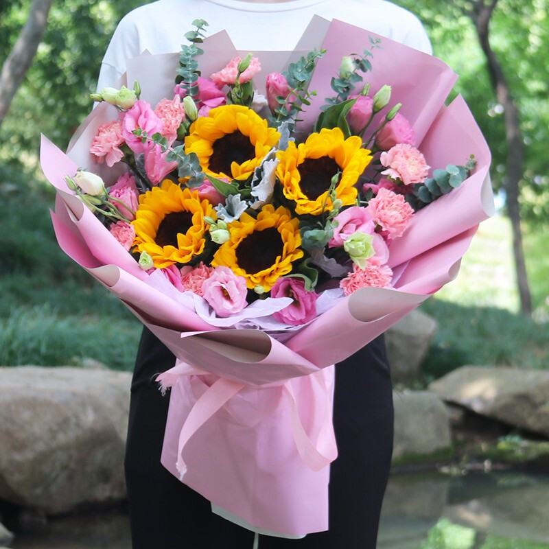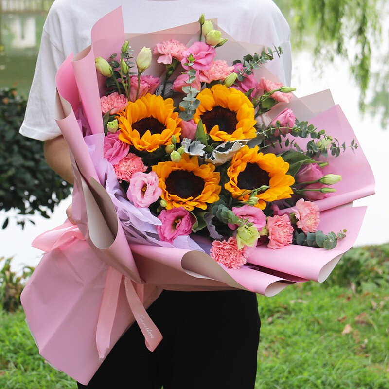 花 材:4支向日葵,8朵粉色康乃馨,6支粉色洋桔梗,尤加利叶装饰。