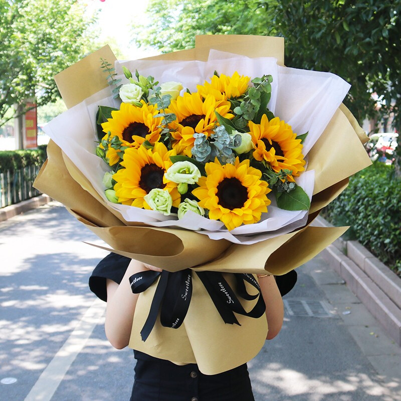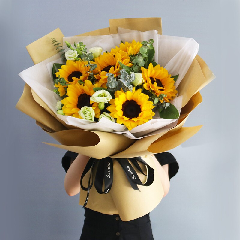花 材:精选6支向日葵,搭配洋桔梗,尤加利叶装饰。