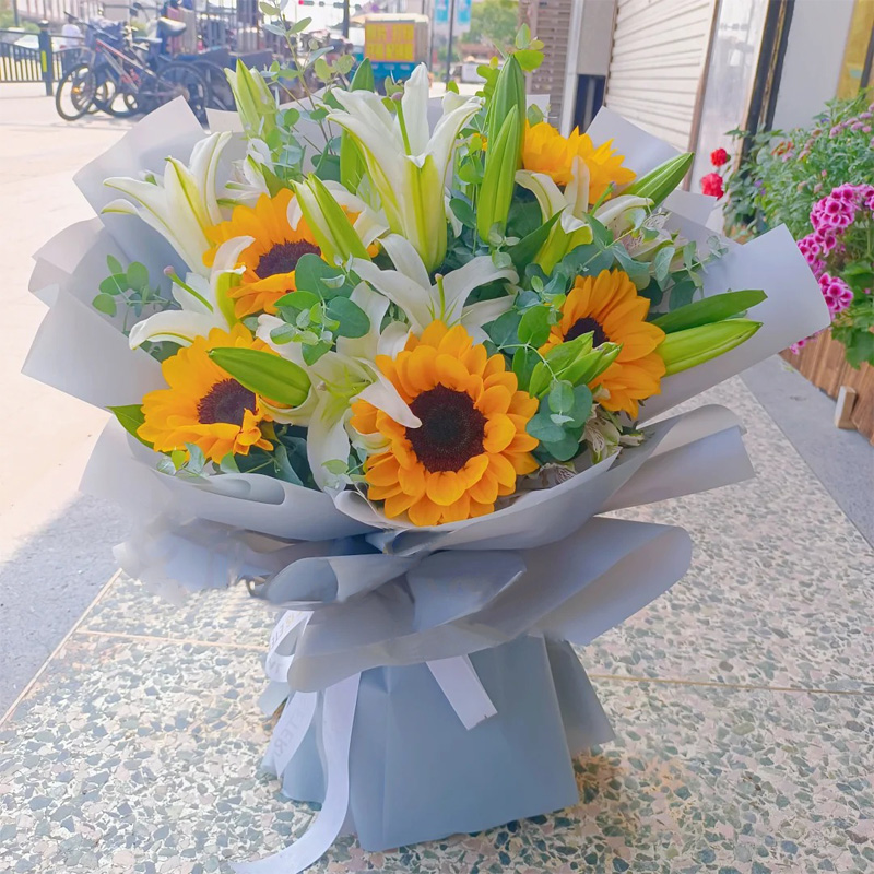花 材:精选5支向日葵,15朵白色香水百合,搭配尤加利叶装饰。