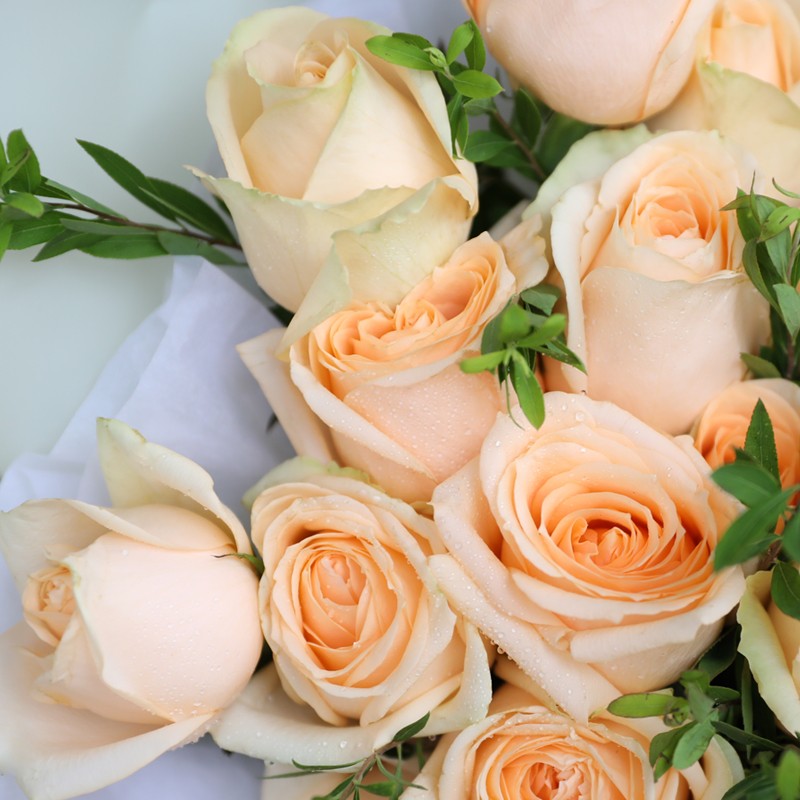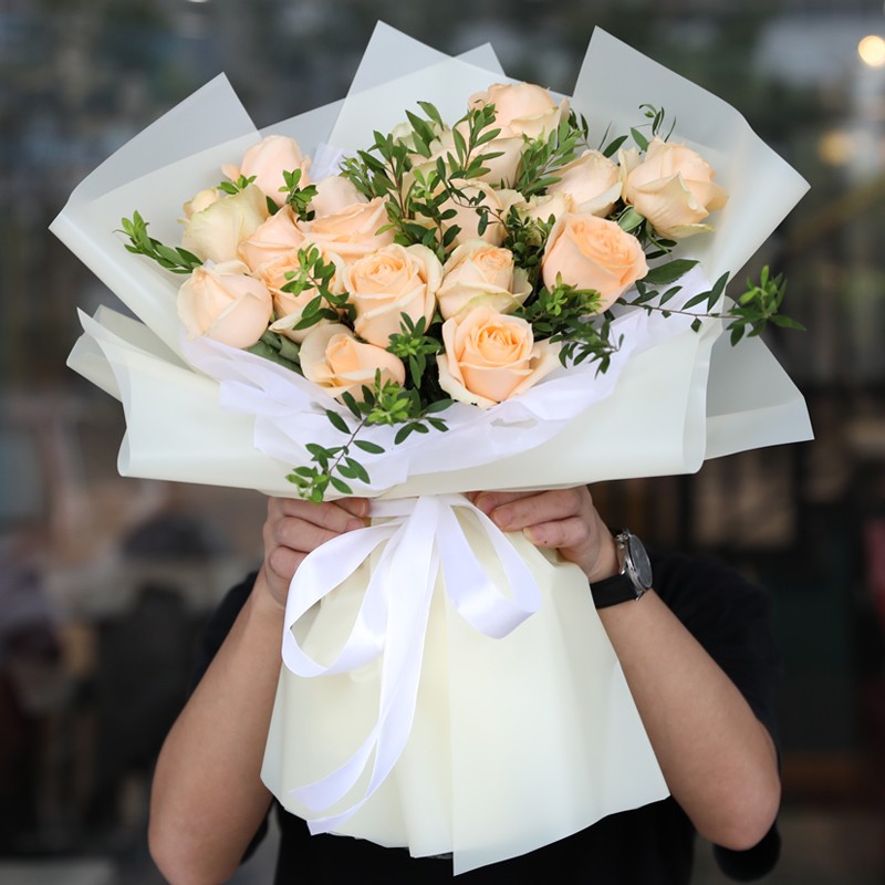 花材: 19支香槟玫瑰,搭配适量细叶尤加利叶装饰。