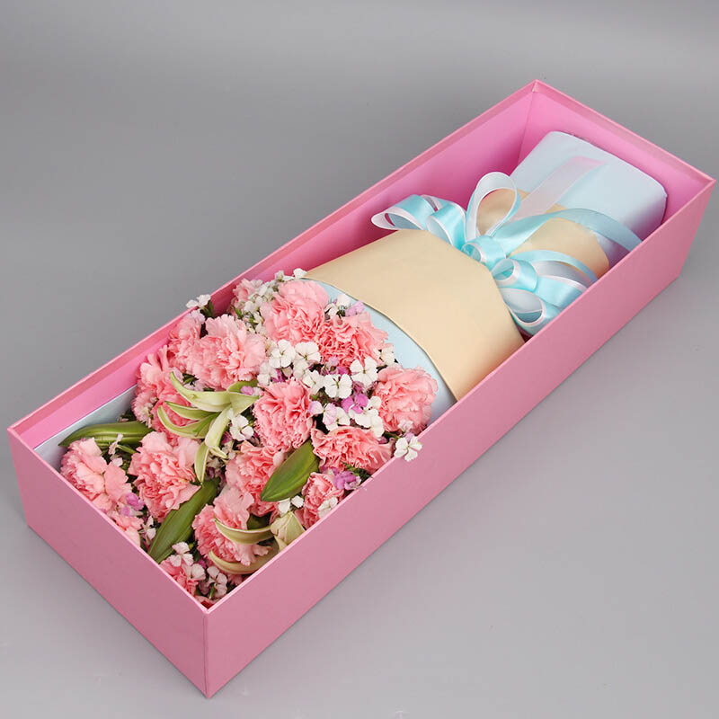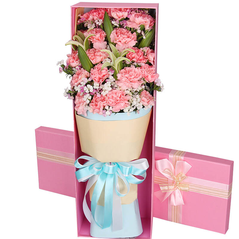 花材: 19朵粉康乃馨,中间1枝白香水百合,黄莺,相思梅搭配。