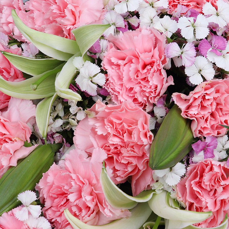 花 材:19朵粉康乃馨,中间1枝白香水百合,黄莺,相思梅搭配。