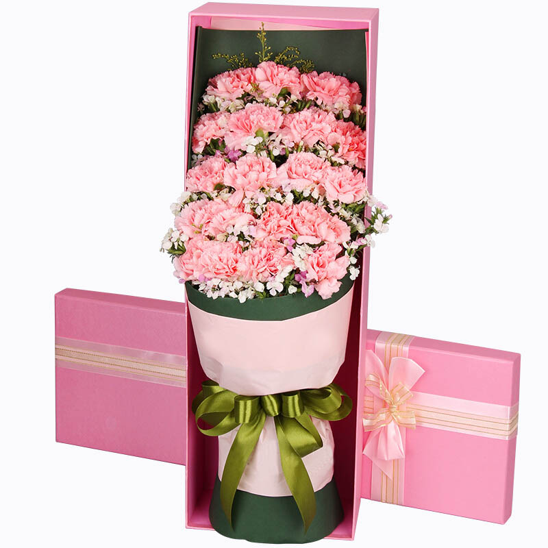 包 装:深绿色平面纸+粉色平面纸扇形包装,绿色缎带束扎,粉色长方形礼盒。