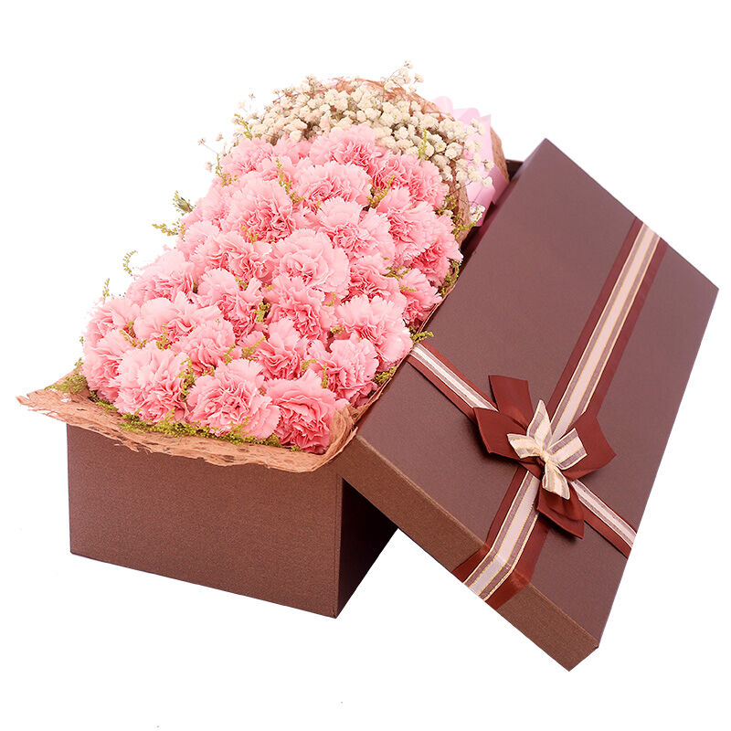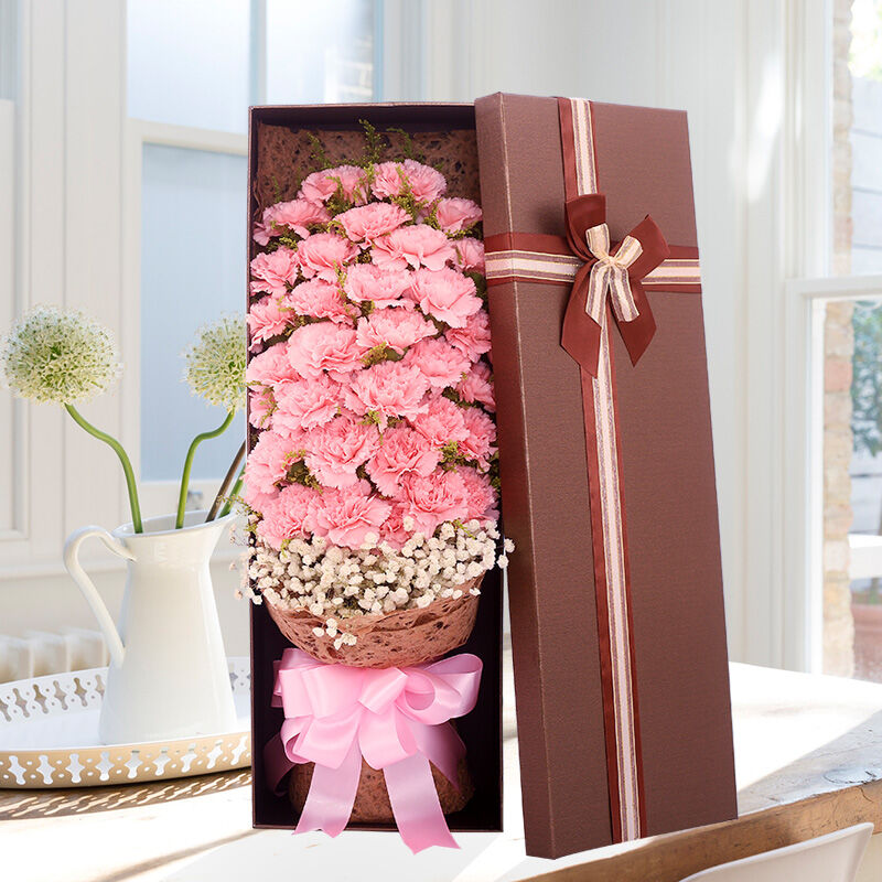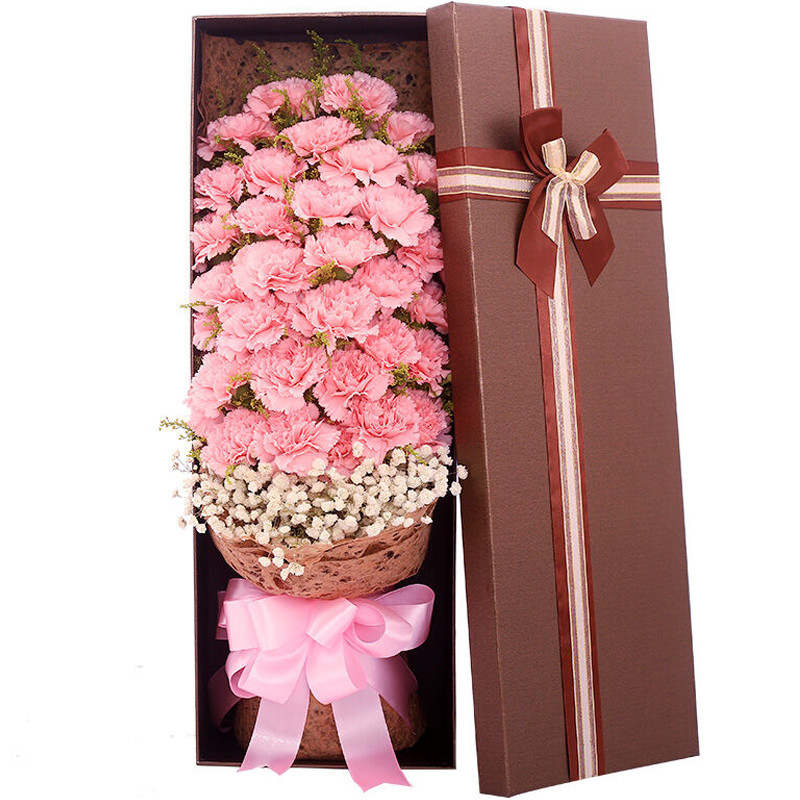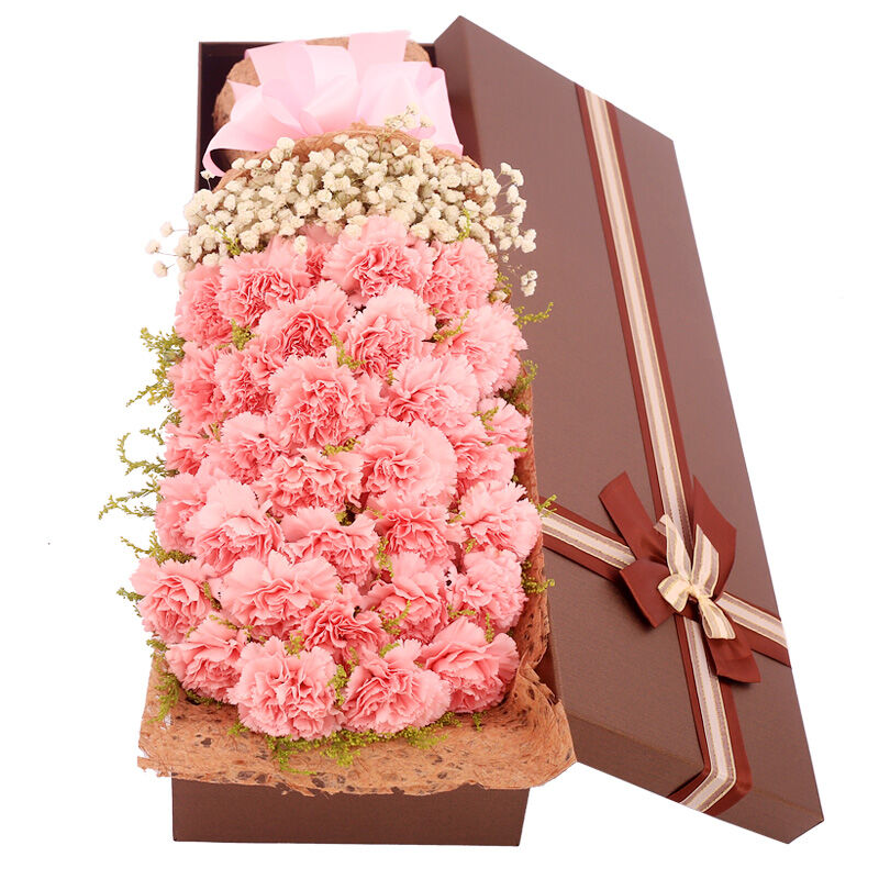 花 材:33支粉色康乃馨,搭配黄莺、满天星。