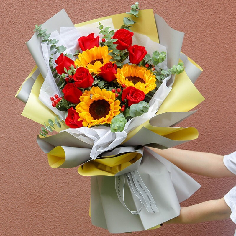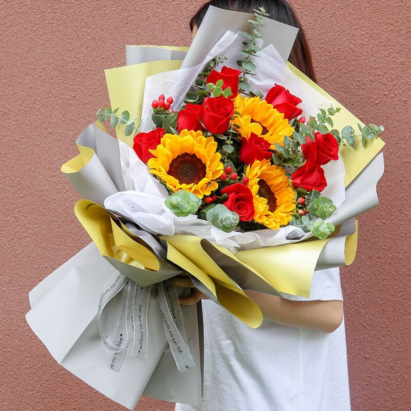 花 材:3支向日葵,9朵红玫瑰,搭配红豆、尤加利叶装饰。