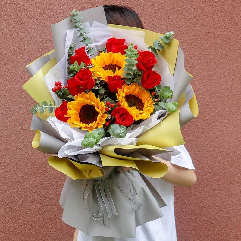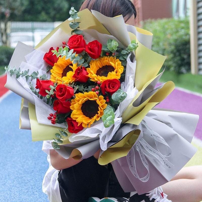 花材: 3支向日葵,9朵红玫瑰,搭配红豆、尤加利叶装饰。