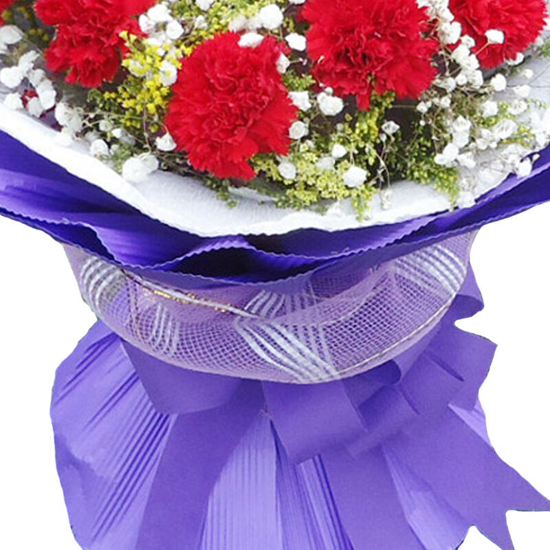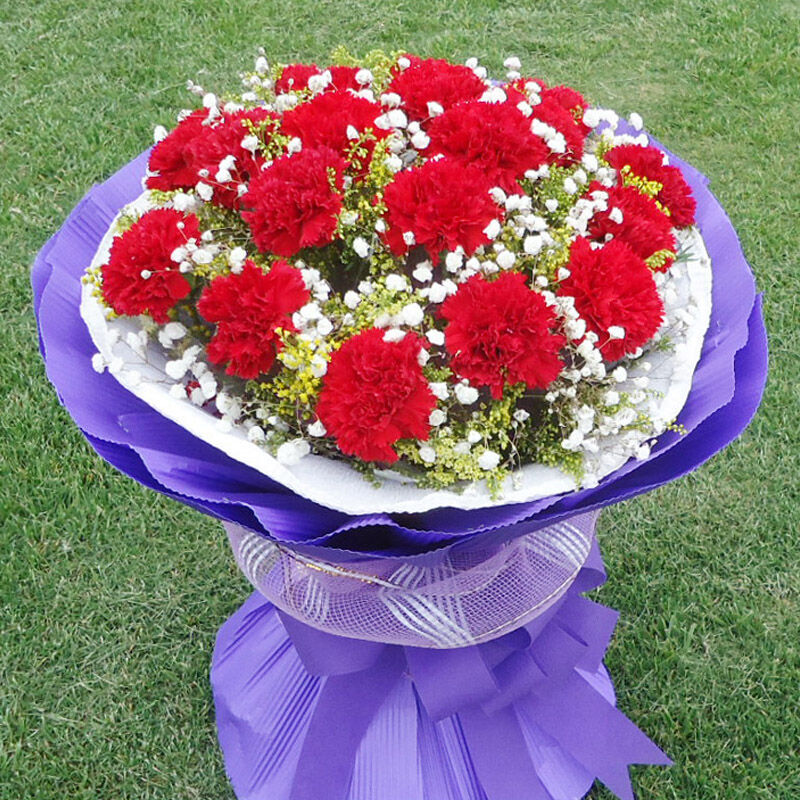 花材: 19朵红色康乃馨,黄莺、勿忘我点缀。