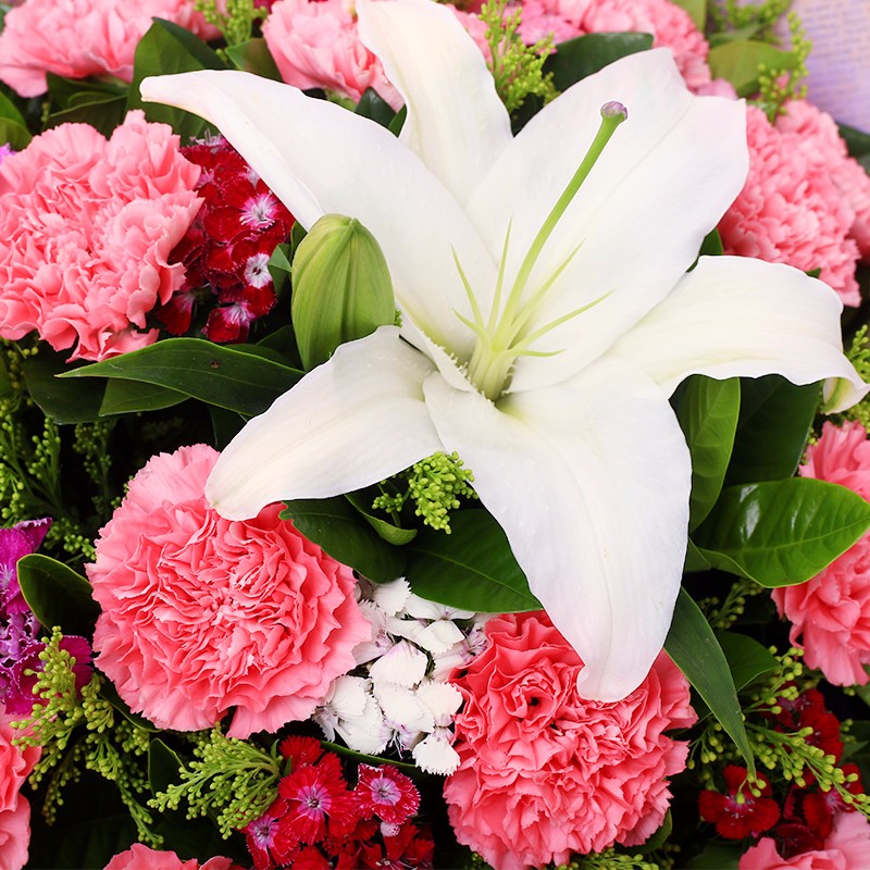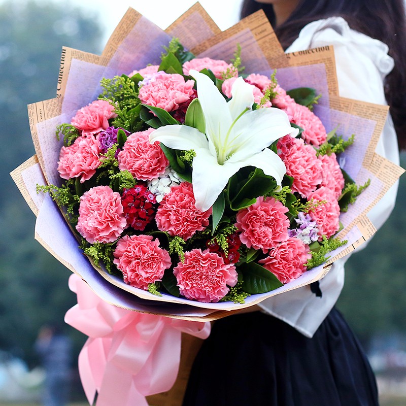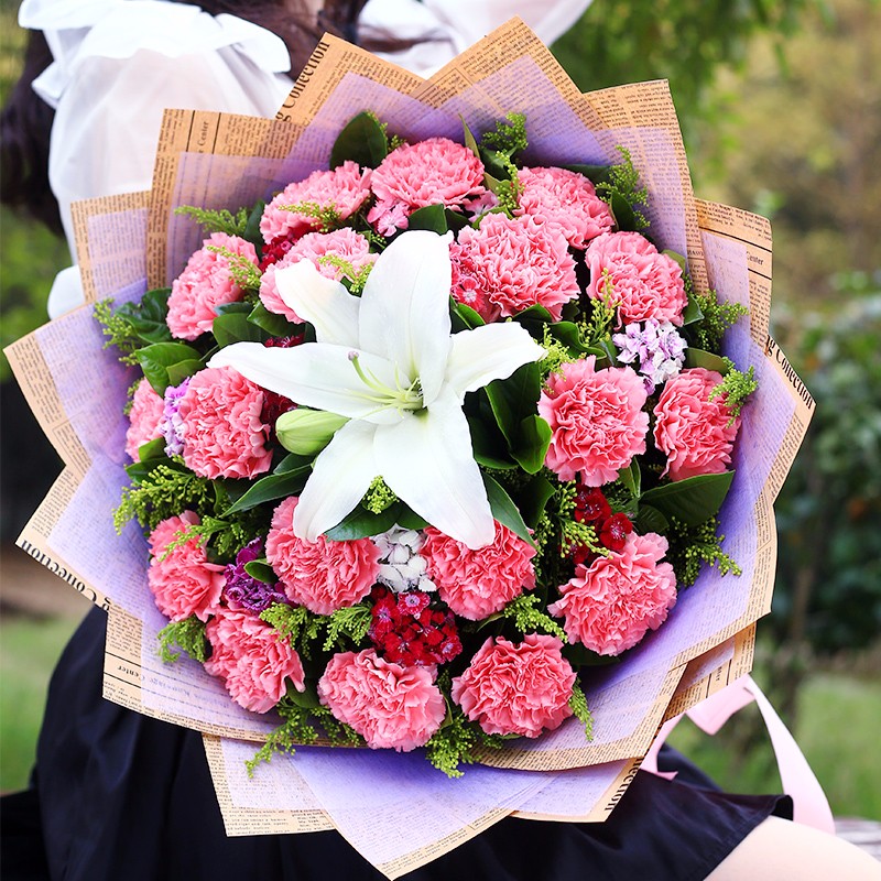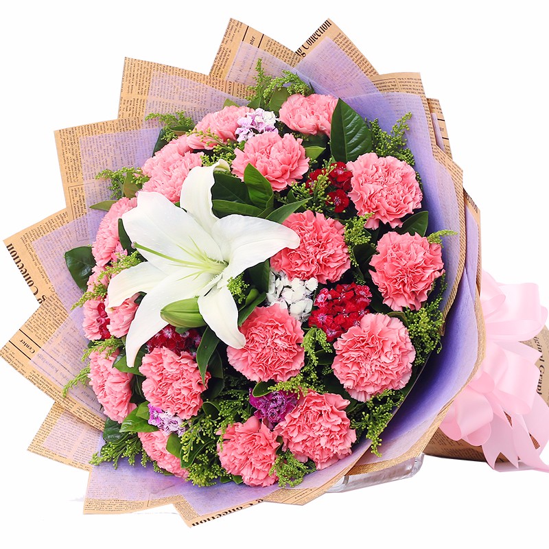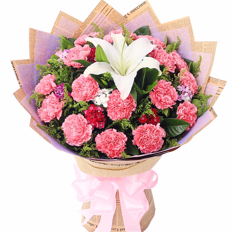 花材: 19支粉色康乃馨,1支香水百合,搭配适量石竹梅、黄莺。