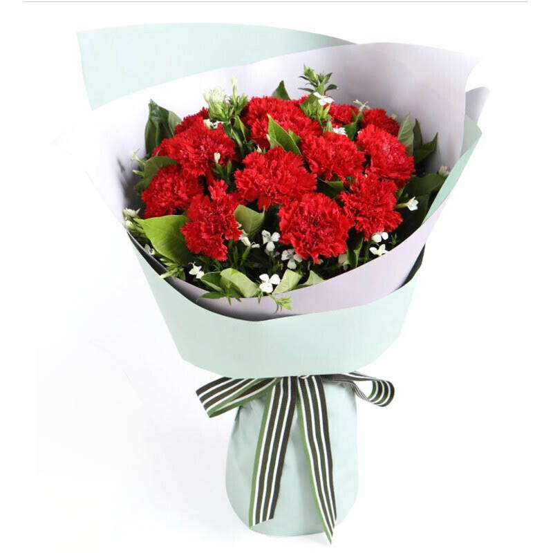 花材: 11支精品红康乃馨,搭配栀子叶、相思梅点缀。