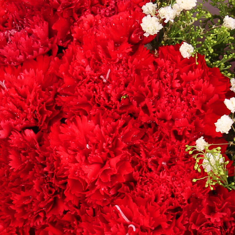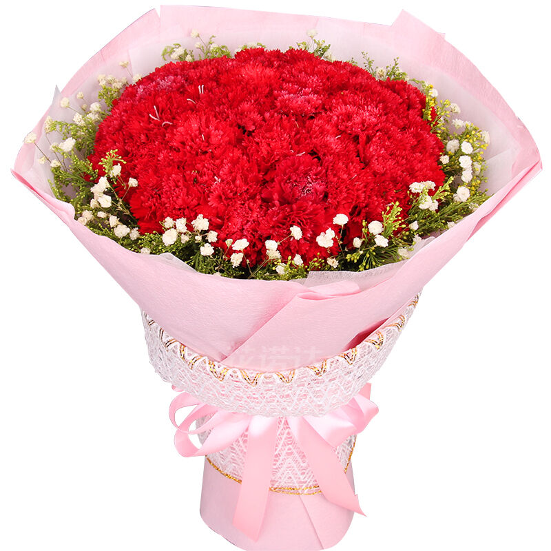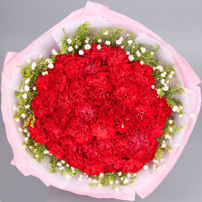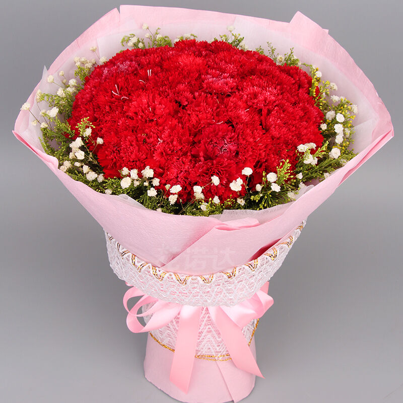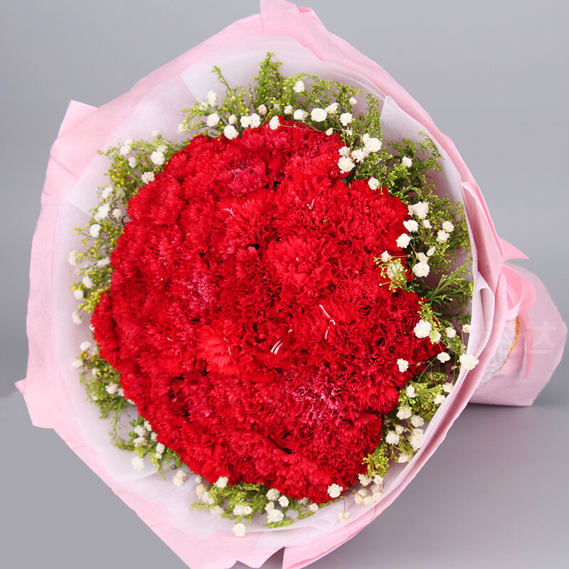 花 材:33支红康乃馨,搭配适量黄莺、满天星。