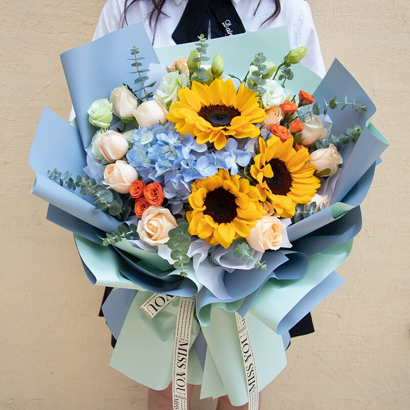 花 材:精选3支向日葵,1支蓝色绣球,11朵香槟玫瑰,搭配2支多头橙色小玫瑰,尤加利叶,桔梗装饰。