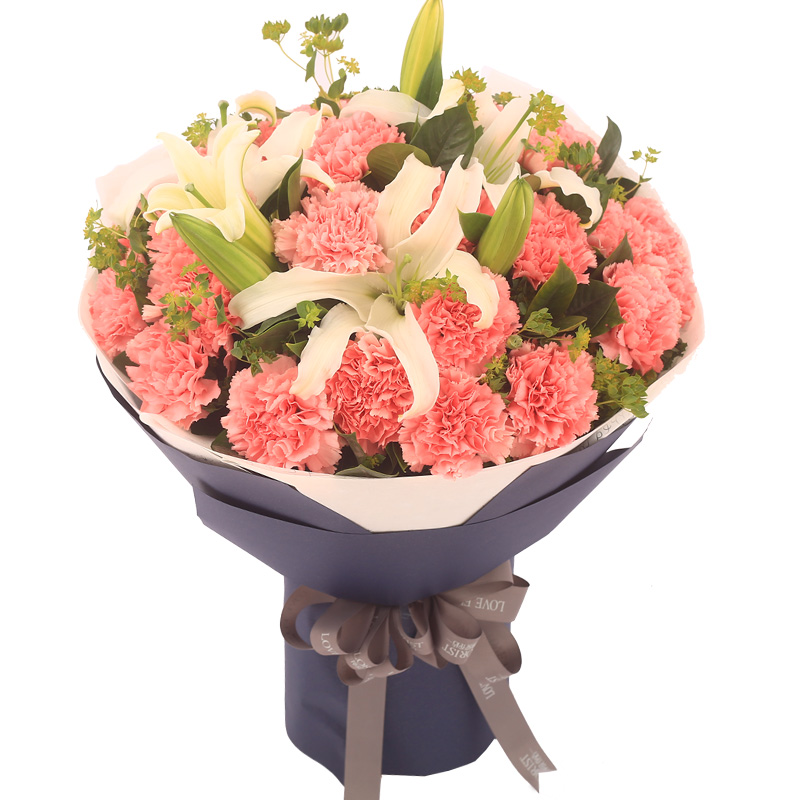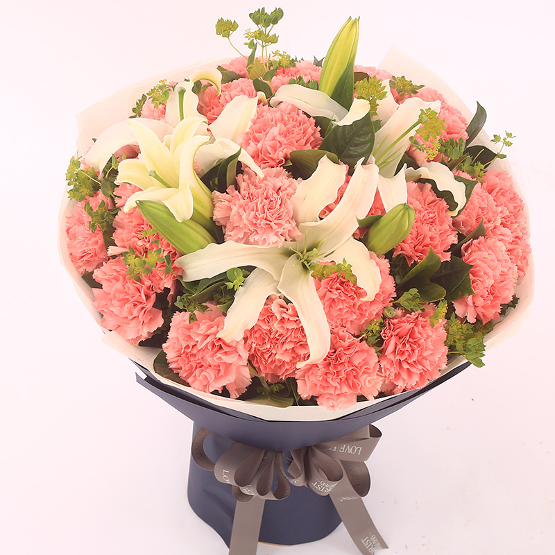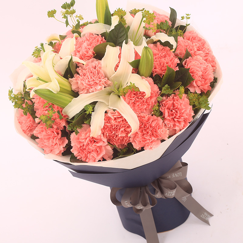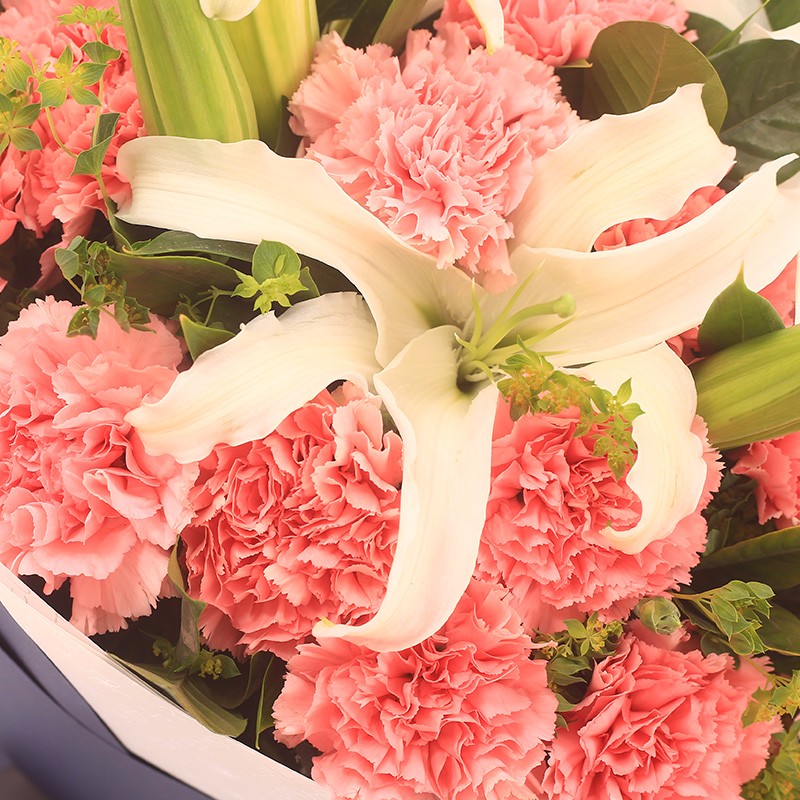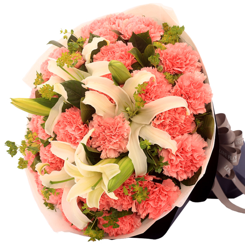 花材: 19支粉色康乃馨,2支白色多头百合,搭配适量叶上黄金。