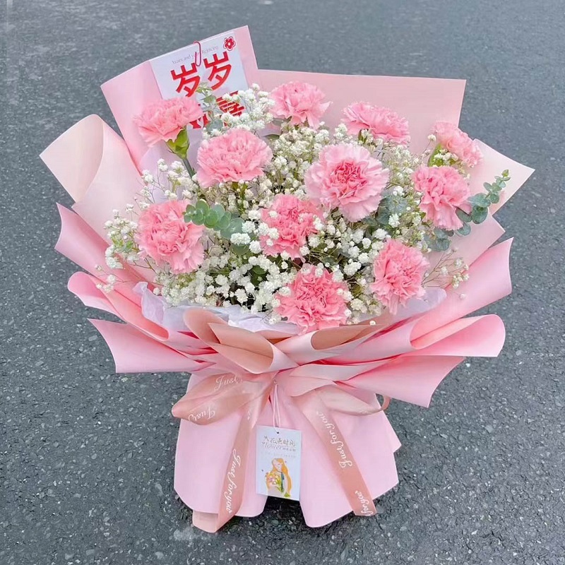 花 材:11支粉色康乃馨,搭配满天星,黄莺装饰。