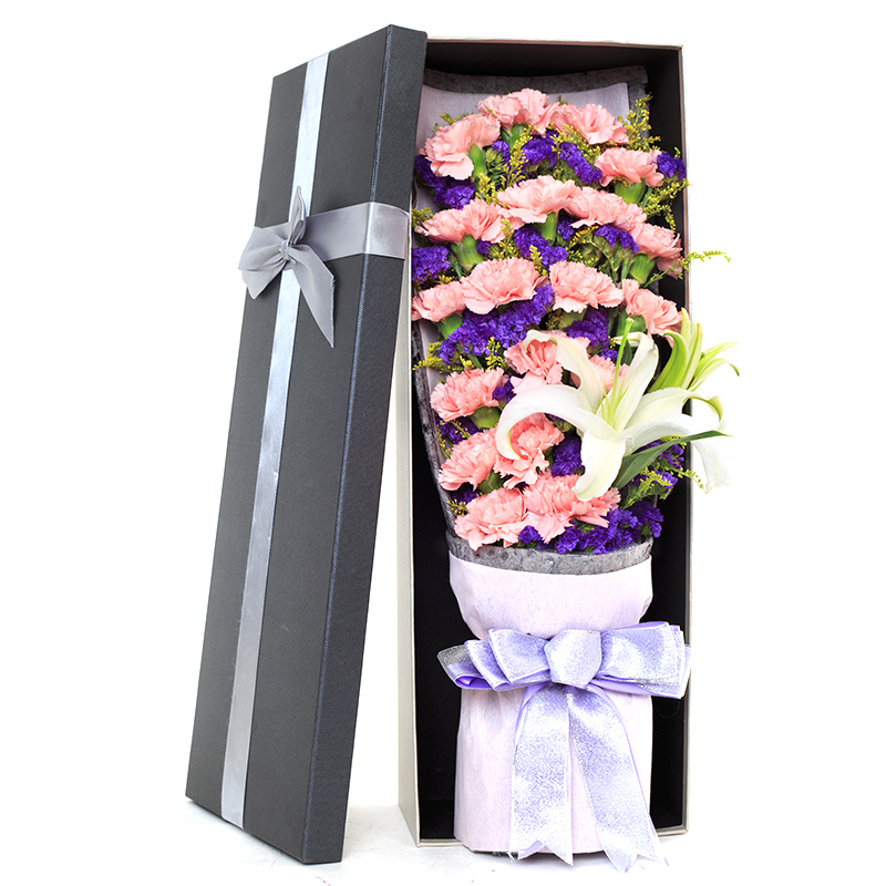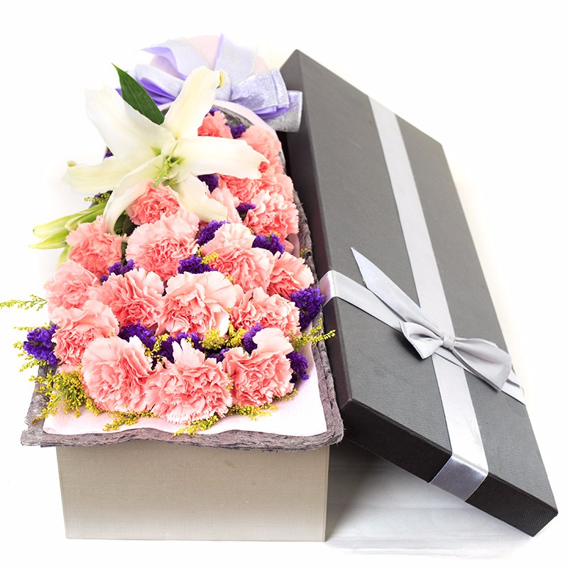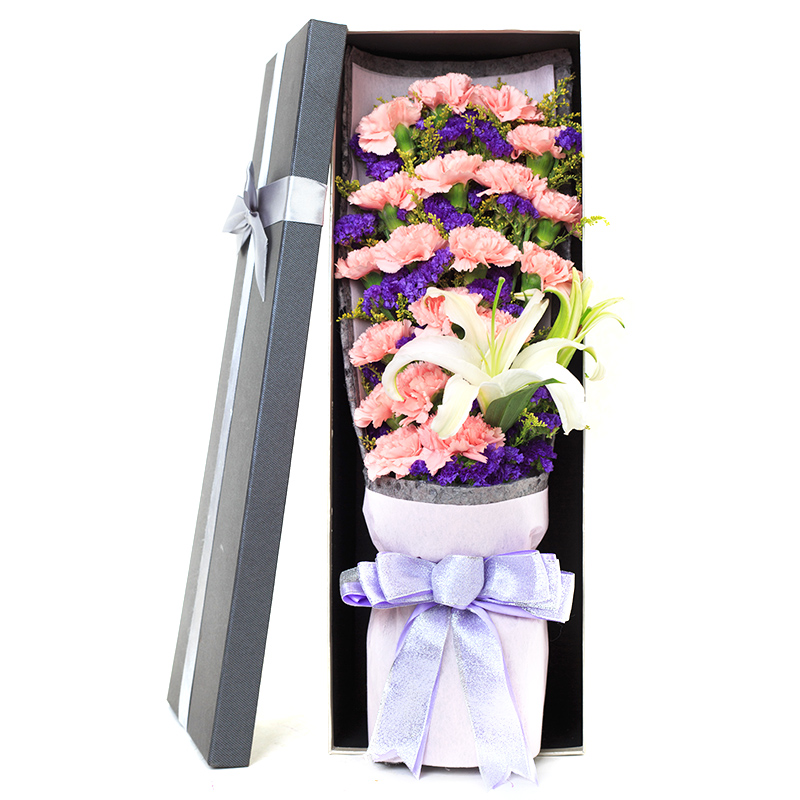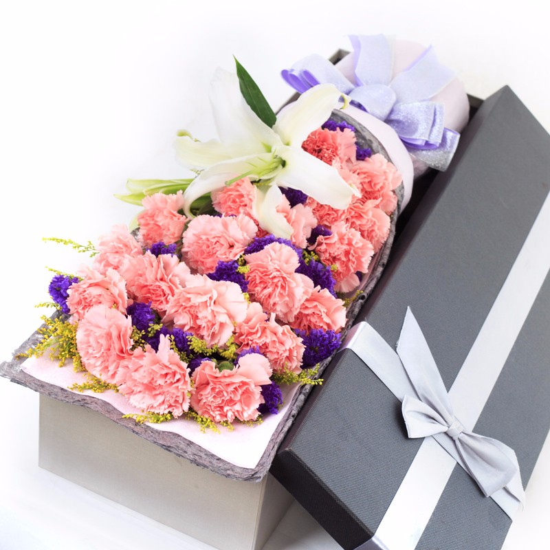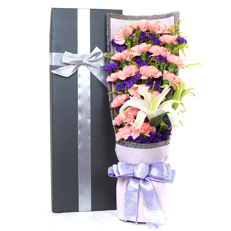 花材: 19支粉色康乃馨,1支白色多头百合,搭配适量黄莺、紫色勿忘我。