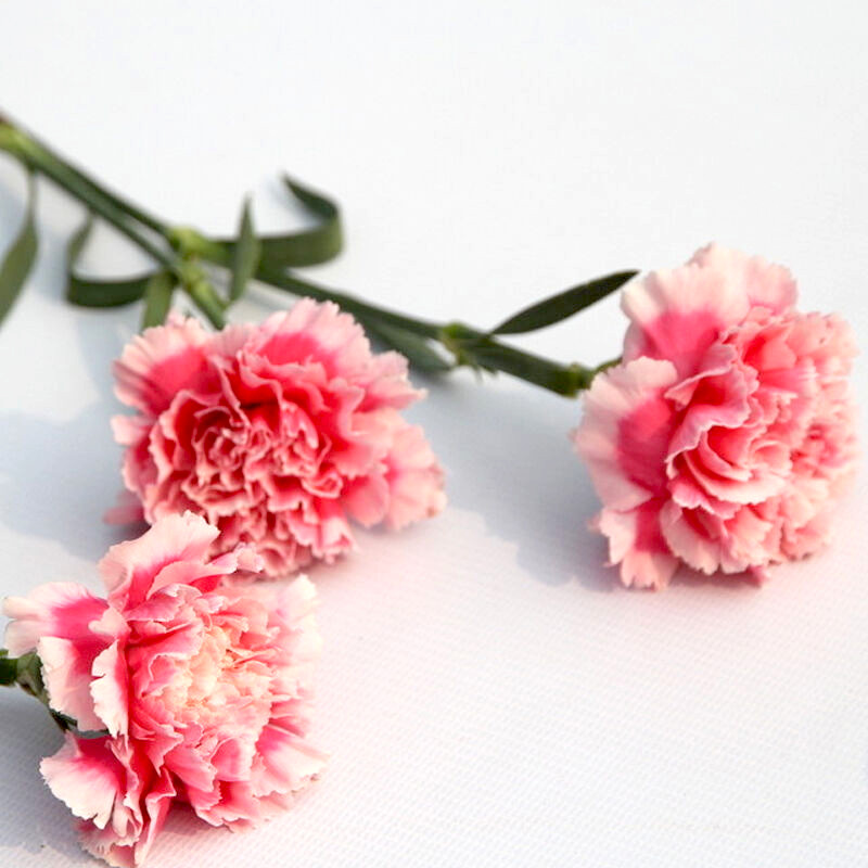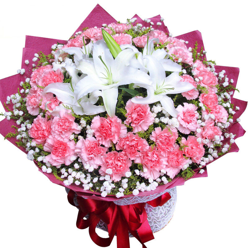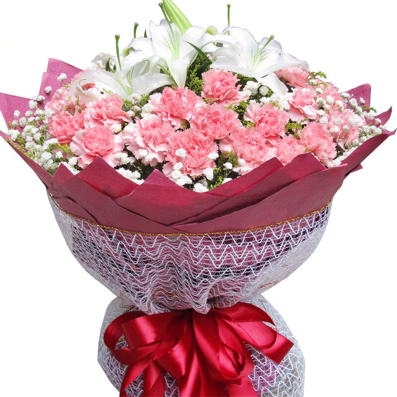 花 材:33支粉色康乃馨,2支多头白百合,搭配黄莺、满天星。