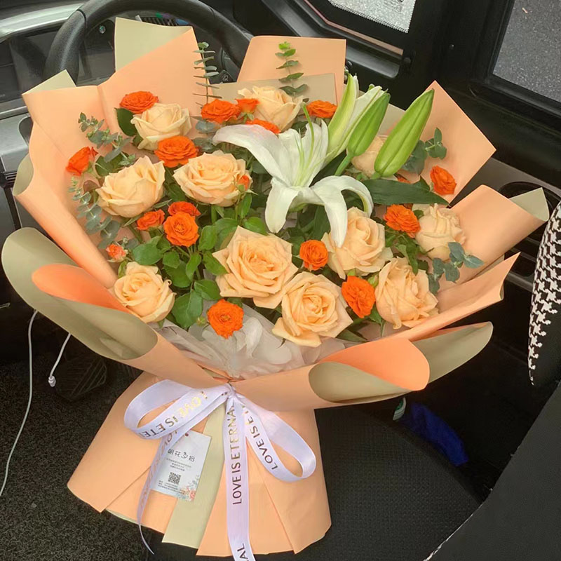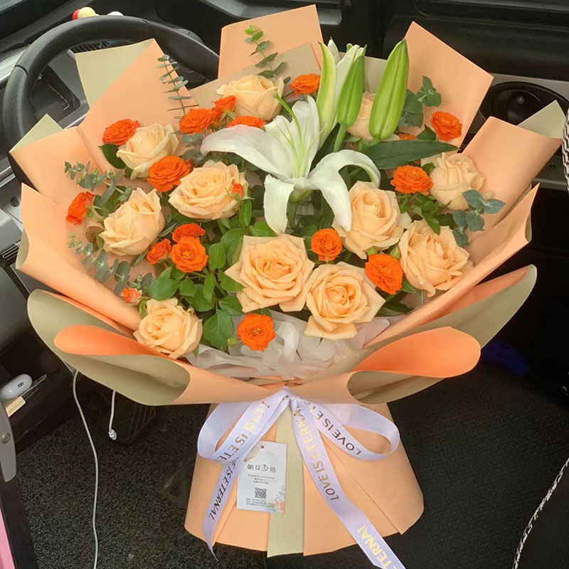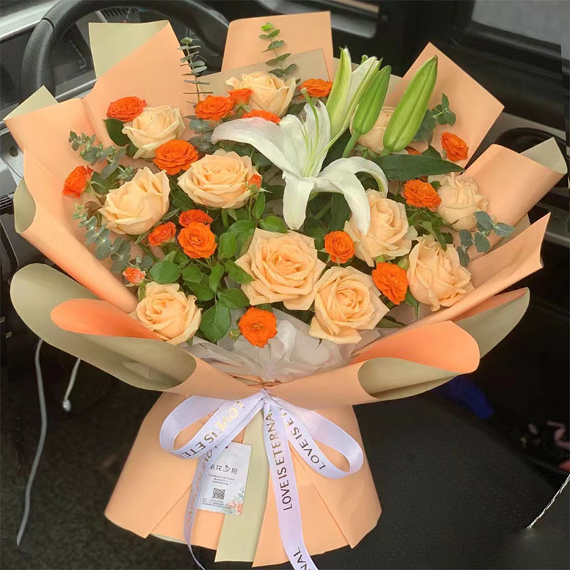 花 材:11朵香槟玫瑰,1支多头白色香水百合,搭配5支橙色多头小玫瑰(断货则用4支粉色洋桔梗代替),尤加利叶,栀子叶装饰。
