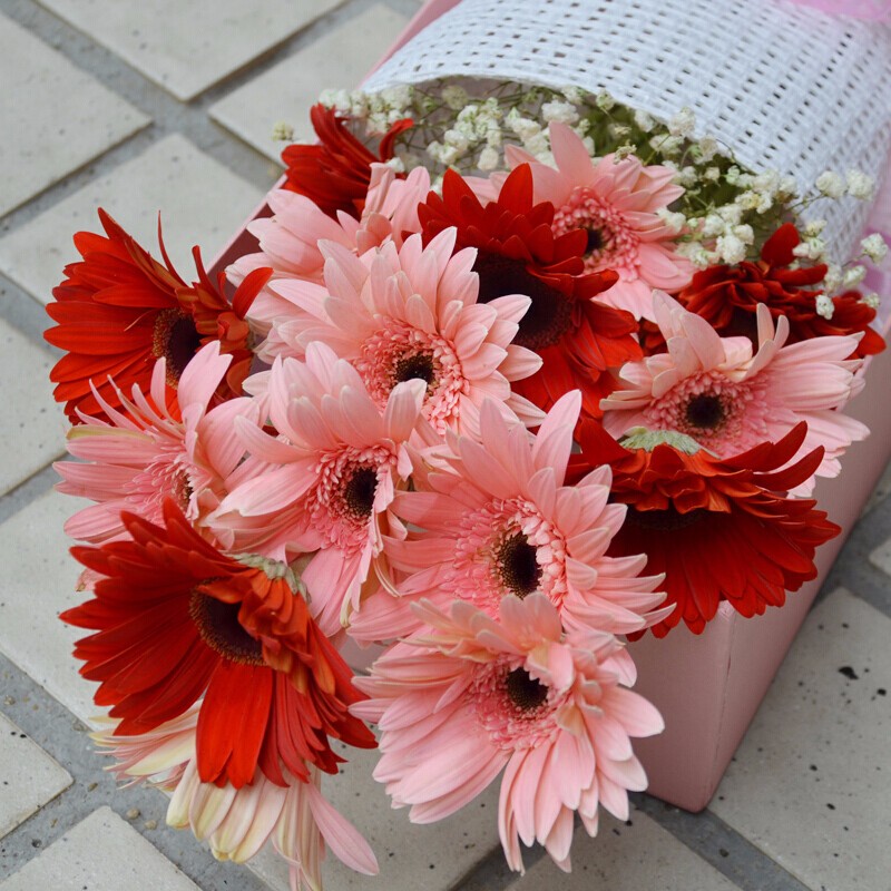 花材: 15朵橙色、粉色混搭扶郎花,满天星点缀。