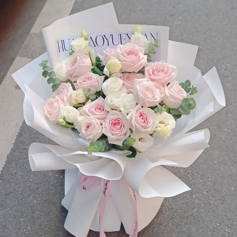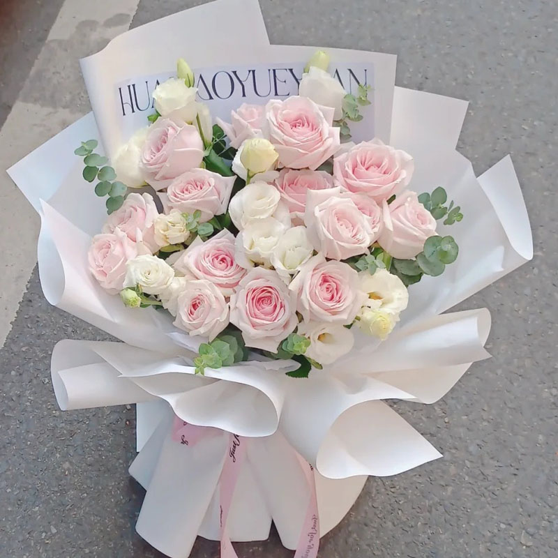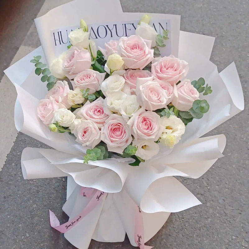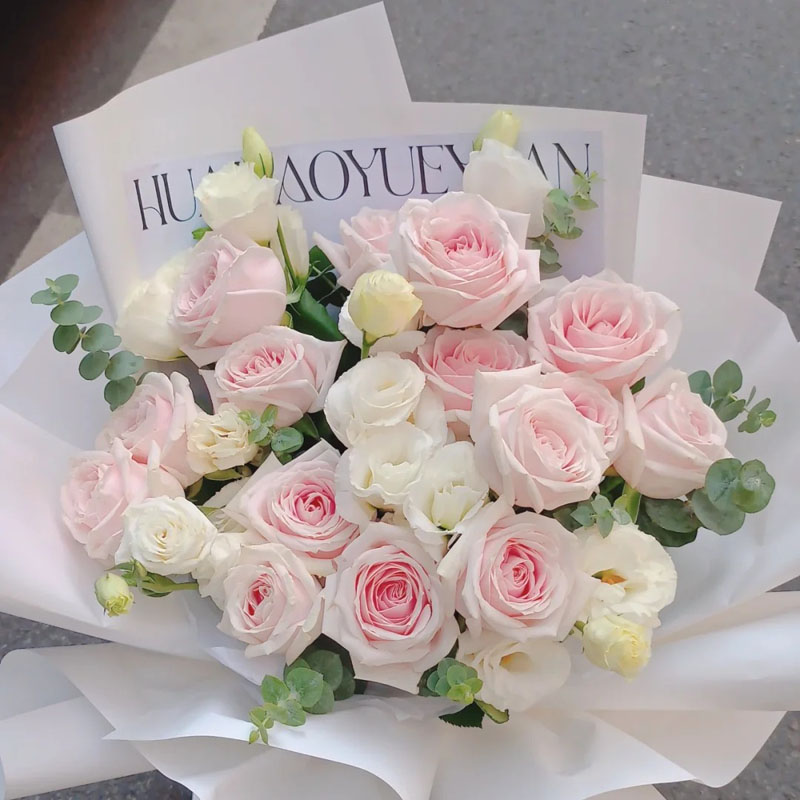 花材: 精选15朵粉玫瑰,8支白色洋桔梗,搭配尤加利叶装饰。