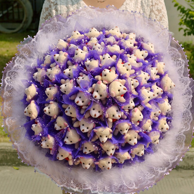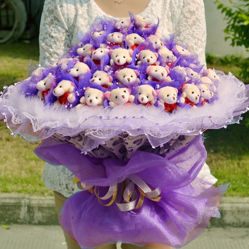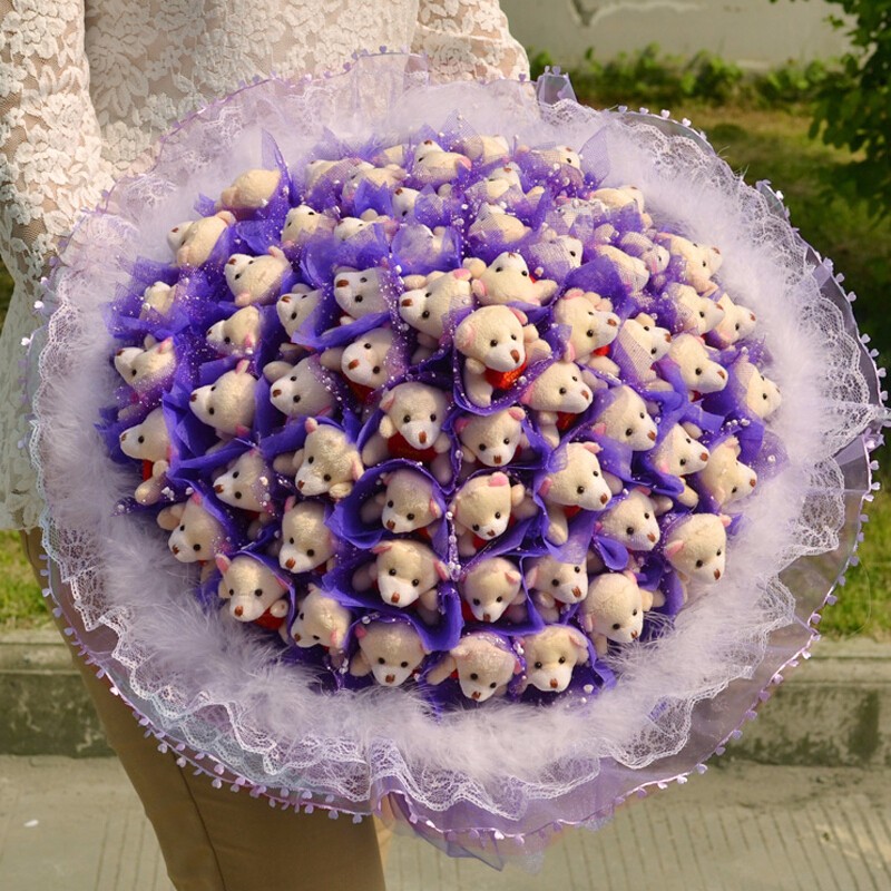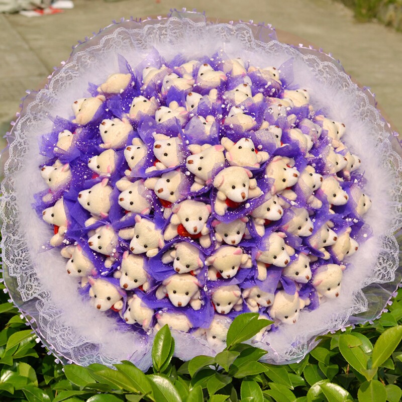 花 材:66只可爱小熊公仔,包成圆形花束。