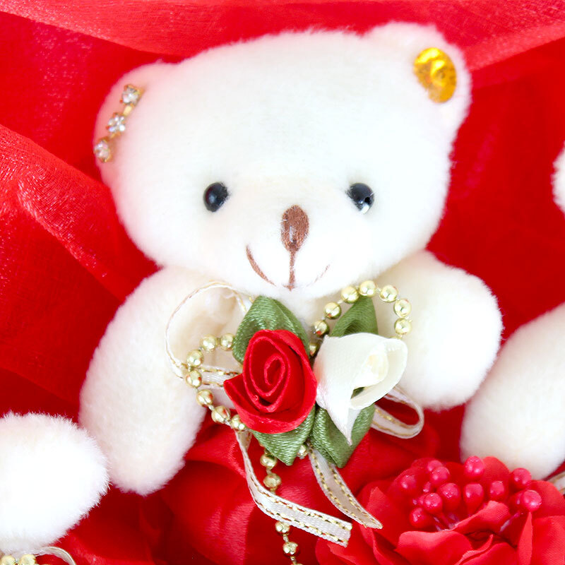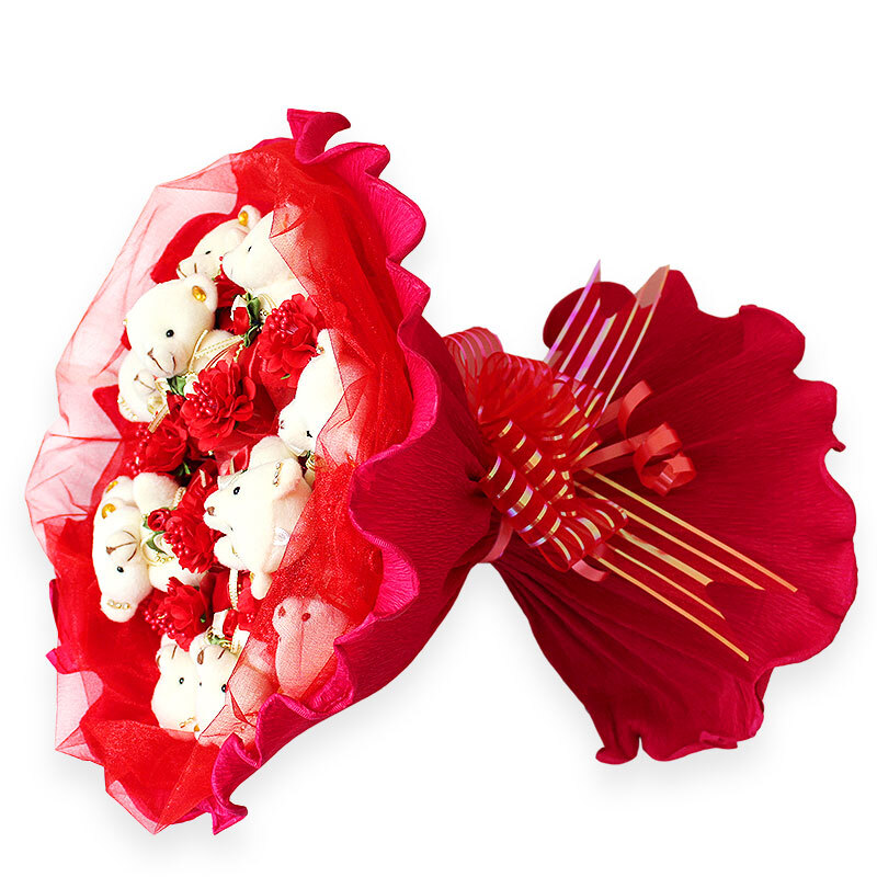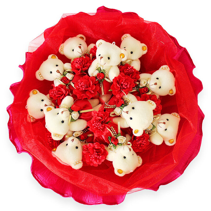 花 材:11只可爱小熊,韩式塑料花点缀。