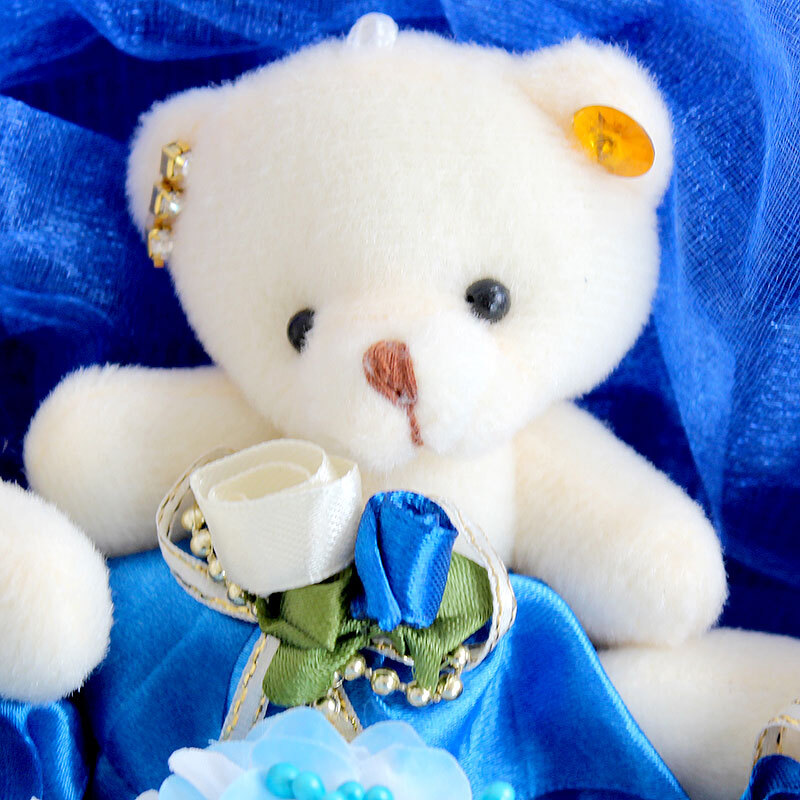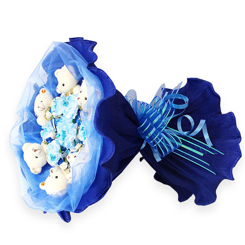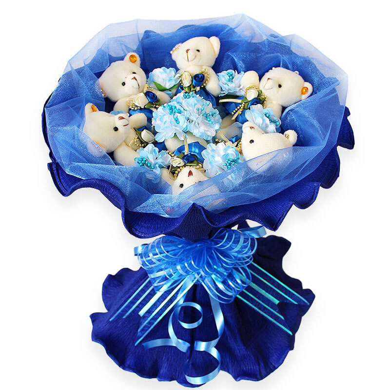 花 材:6只可爱小熊,韩式塑料花点缀。
