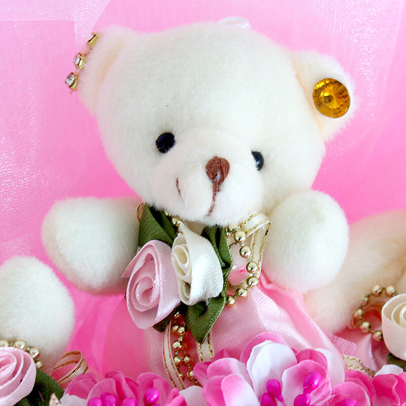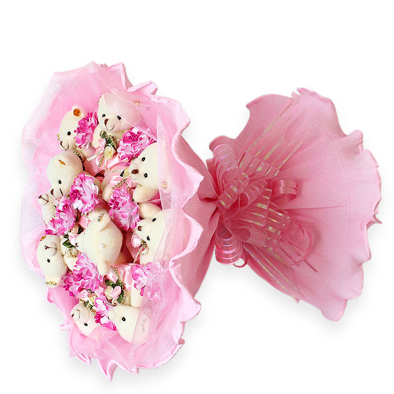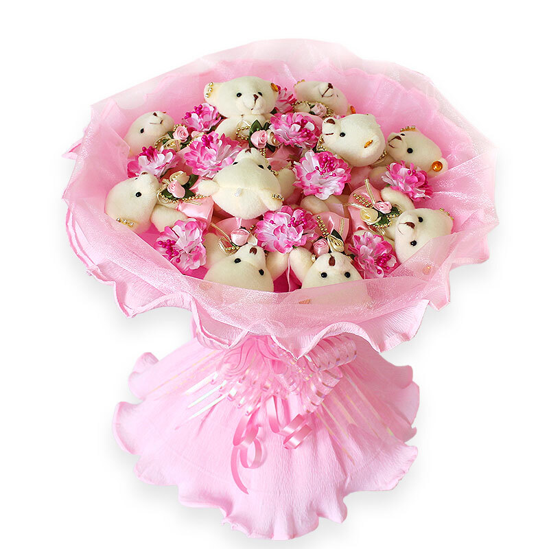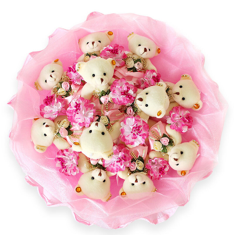 花 材:11只可爱小熊,韩式塑料花点缀。