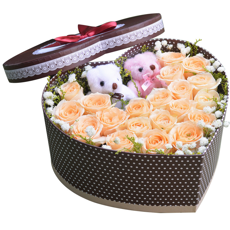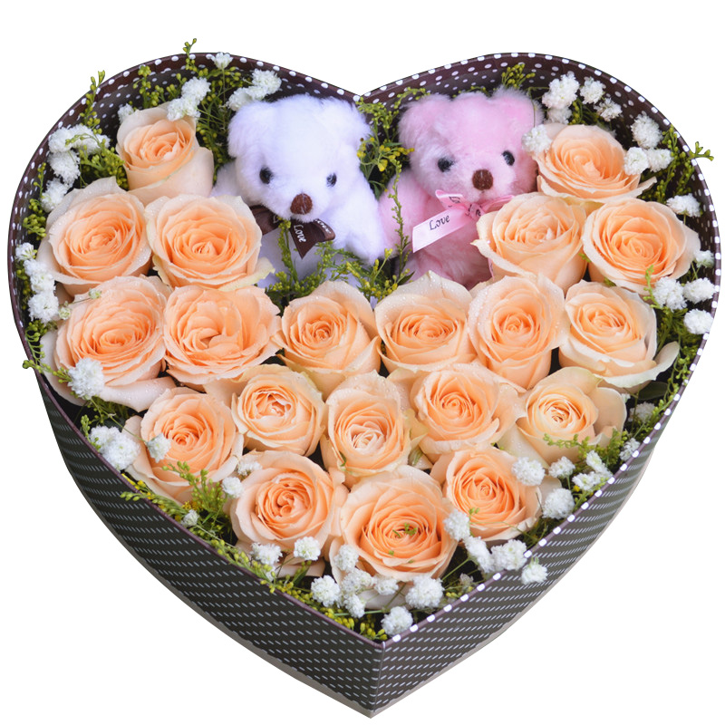 花材: 21支精品香槟玫瑰+2支可爱小熊,搭配适量白色满天星、黄莺。