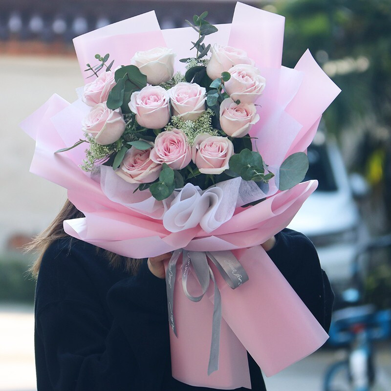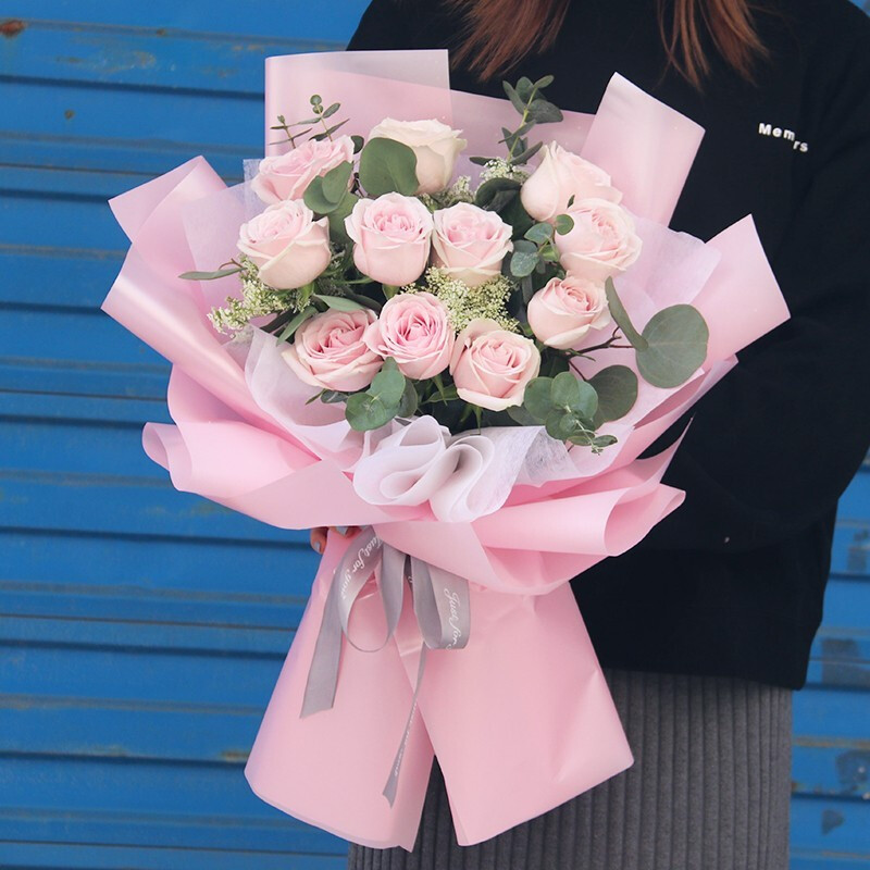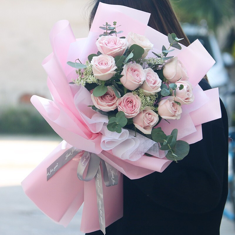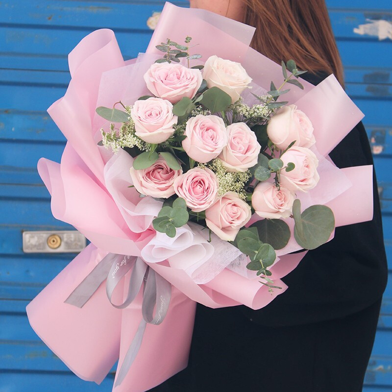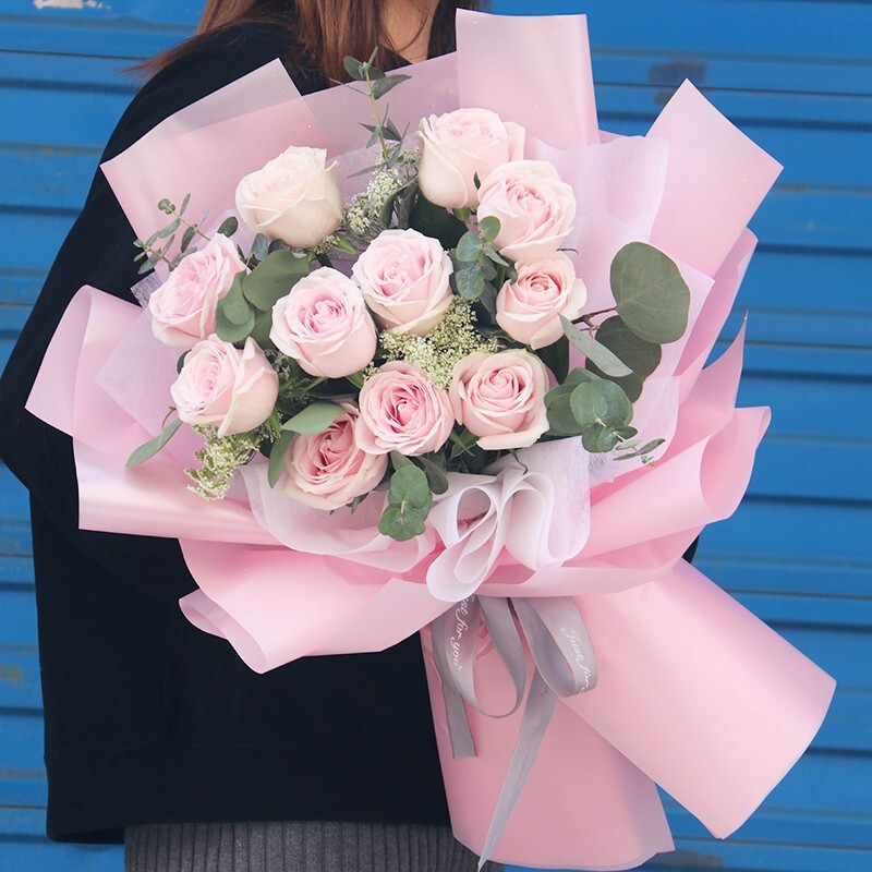 花 材:11朵精品粉玫瑰,搭配白色满天星,尤加利叶装饰。