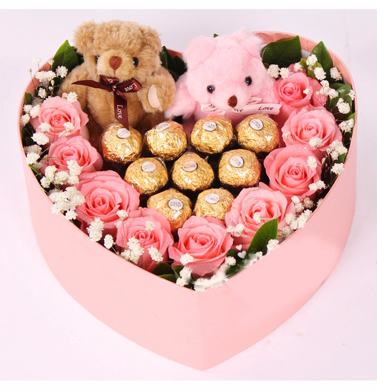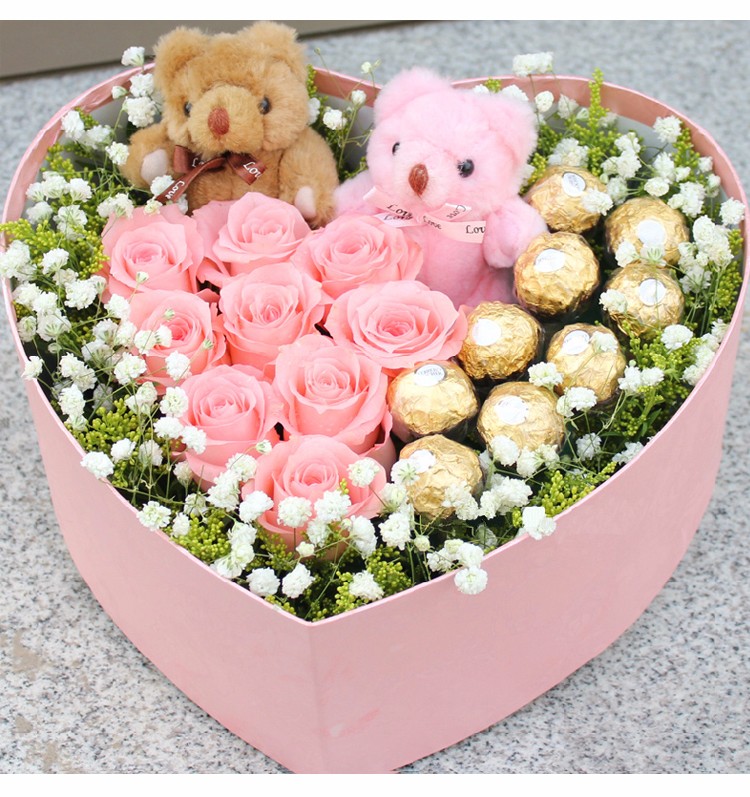 花 材:9朵顶级粉玫瑰,9颗费列罗,一对可爱小熊,满天星、栀子叶围边环绕。