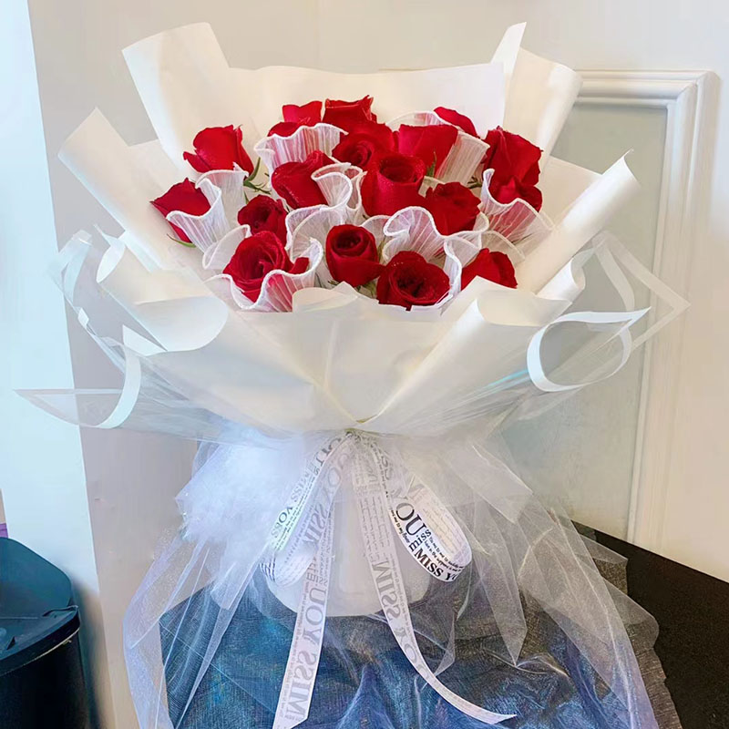花材: 19支精品红玫瑰,波浪纱穿插花间装饰。