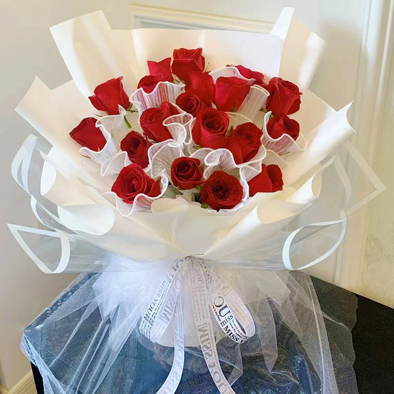 花 材:19支精品红玫瑰,波浪纱穿插花间装饰。