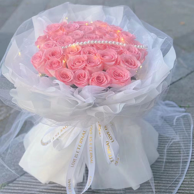 花 材:精选33朵粉玫瑰,1条灯串,1条珠串装饰花面。