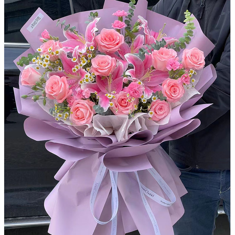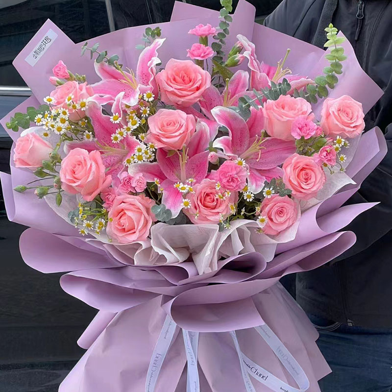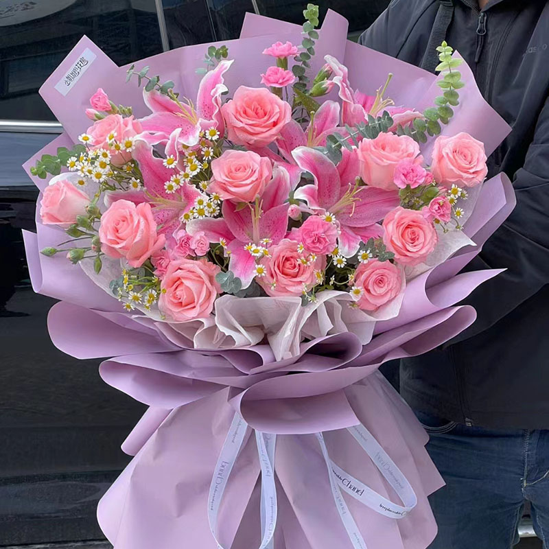 花 材: 11朵粉玫瑰,3支多头粉色香水百合,搭配多头粉康,尤加利叶、洋甘菊、洋桔梗装饰。
