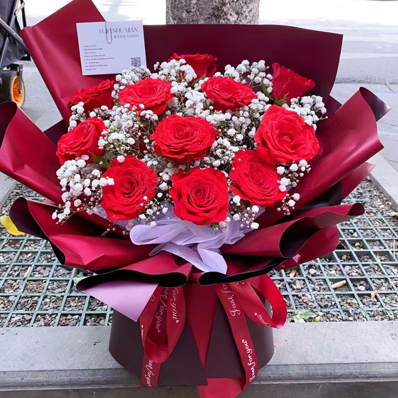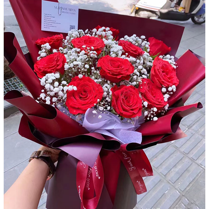 花 材:11朵红玫瑰,搭配满天星装饰。