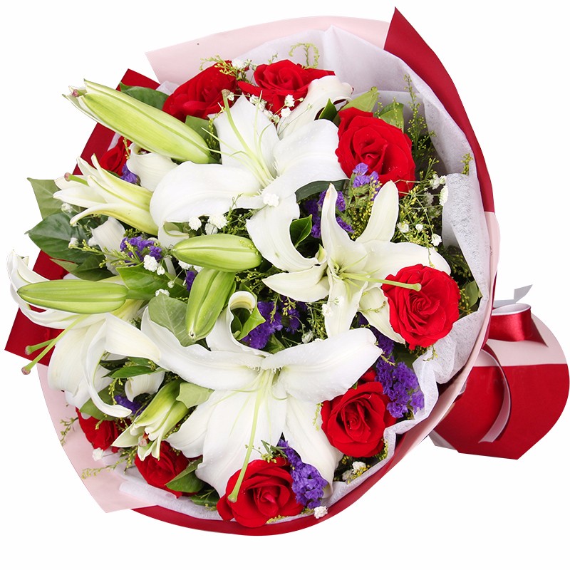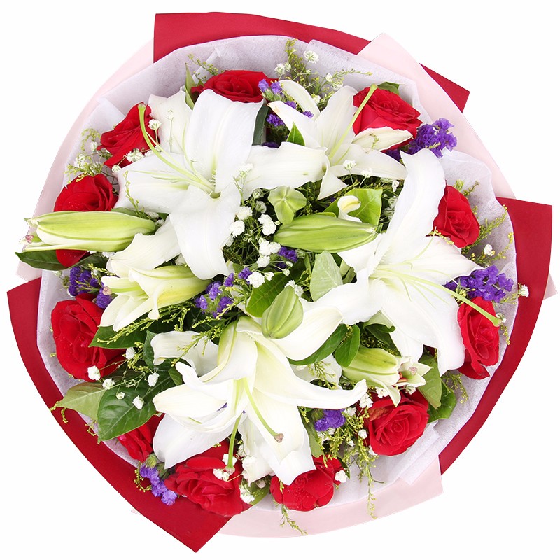 花材: 11支精品红玫瑰+3支多头白百合,搭配适量紫色勿忘我、白色满天星、黄莺草、栀子叶。