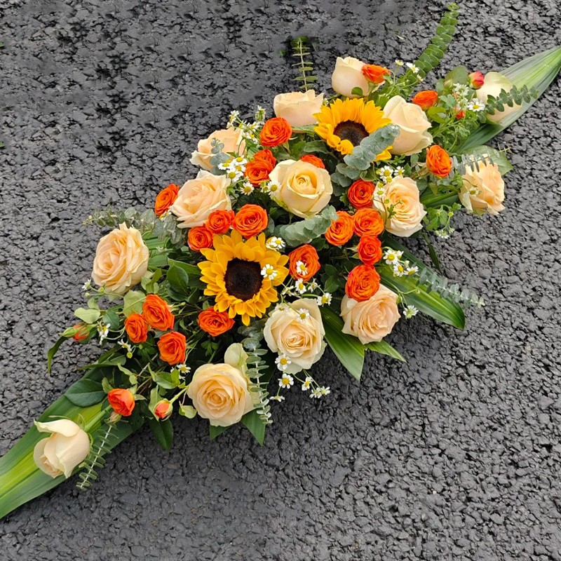 包 装:14朵香槟玫瑰,2朵向日葵,6枝多头橙色泡泡玫瑰,洋甘菊、剑兰、尤加利叶点缀装饰